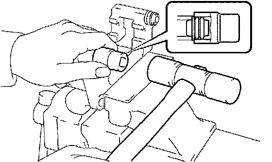 d. Using a socket wrench (19 mm) and a hammer, drive the 2 front disc brake bush dust boots to the front disc brake cylinder mounting LH.