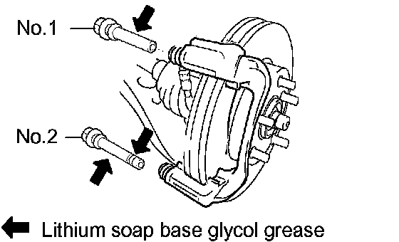 a. Apply lithium soap base glycol grease to the sliding part and the sealing surface of the front disc brake cylinder slide pin (No.1) and front disc brake cylinder slide pin (No.2).