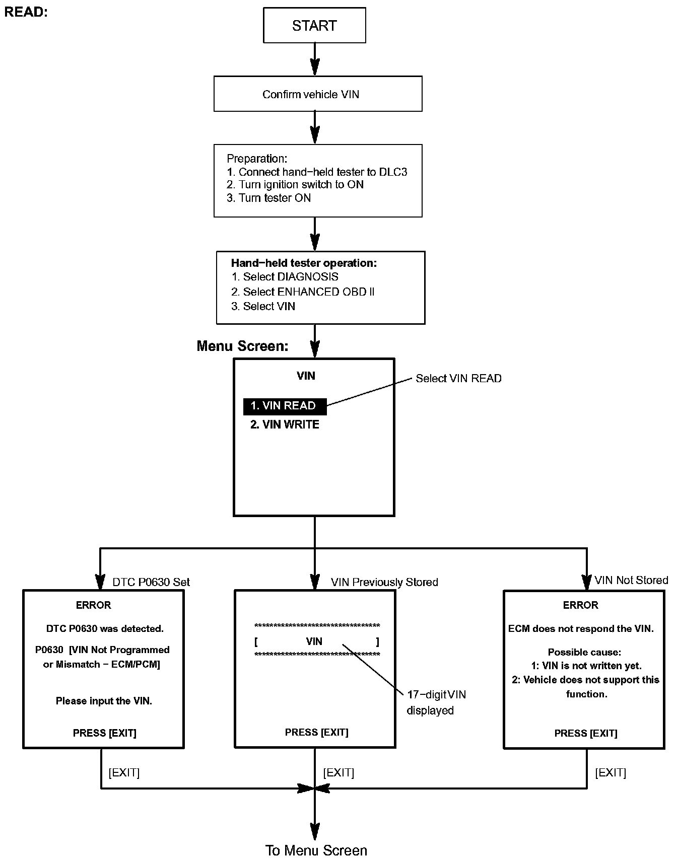 b. Read VIN: Explains the VIN reading process in a flowchart. This process allows the VIN stored in the ECM to be read, in order to confirm that the two VINs, provided with the vehicle and stored in the vehicle's ECM, are the same.