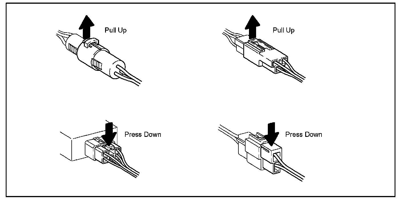 DISCONNECTION OF MALE AND FEMALE CONNECTORSTo pull apart the connectors, pull on the connector itself, the wire harness.