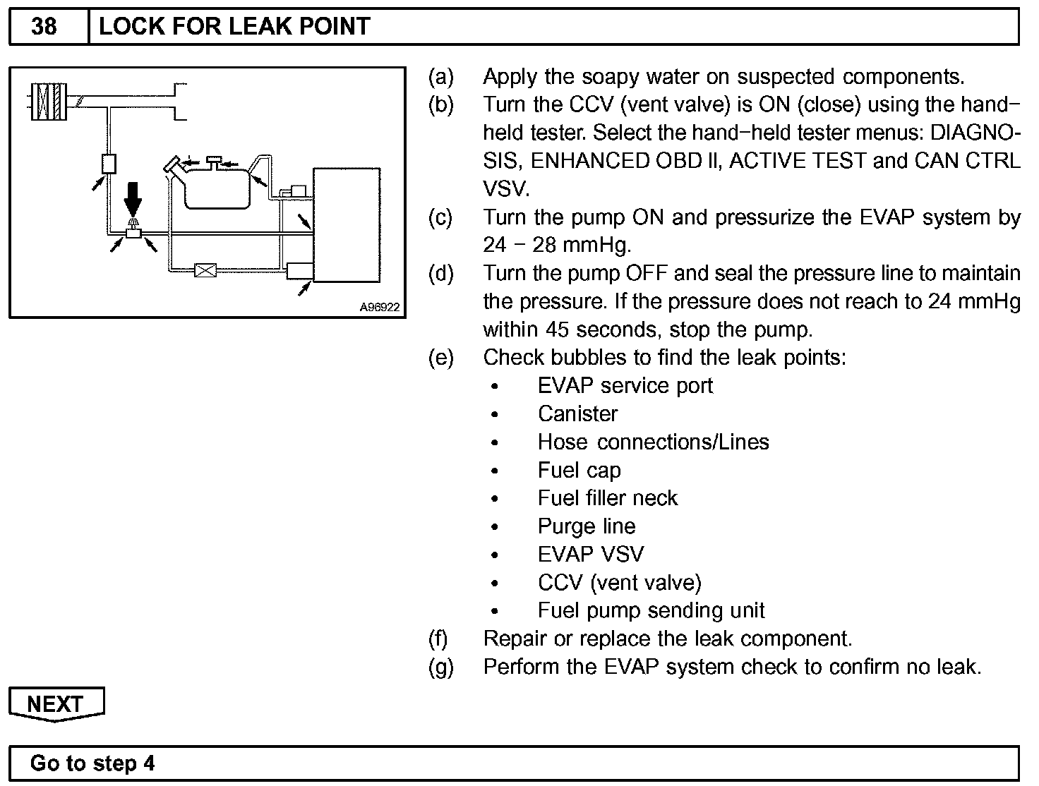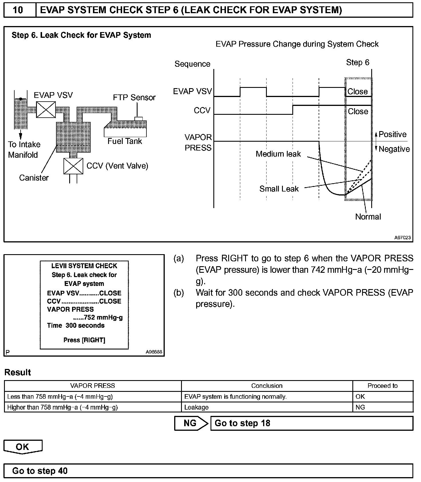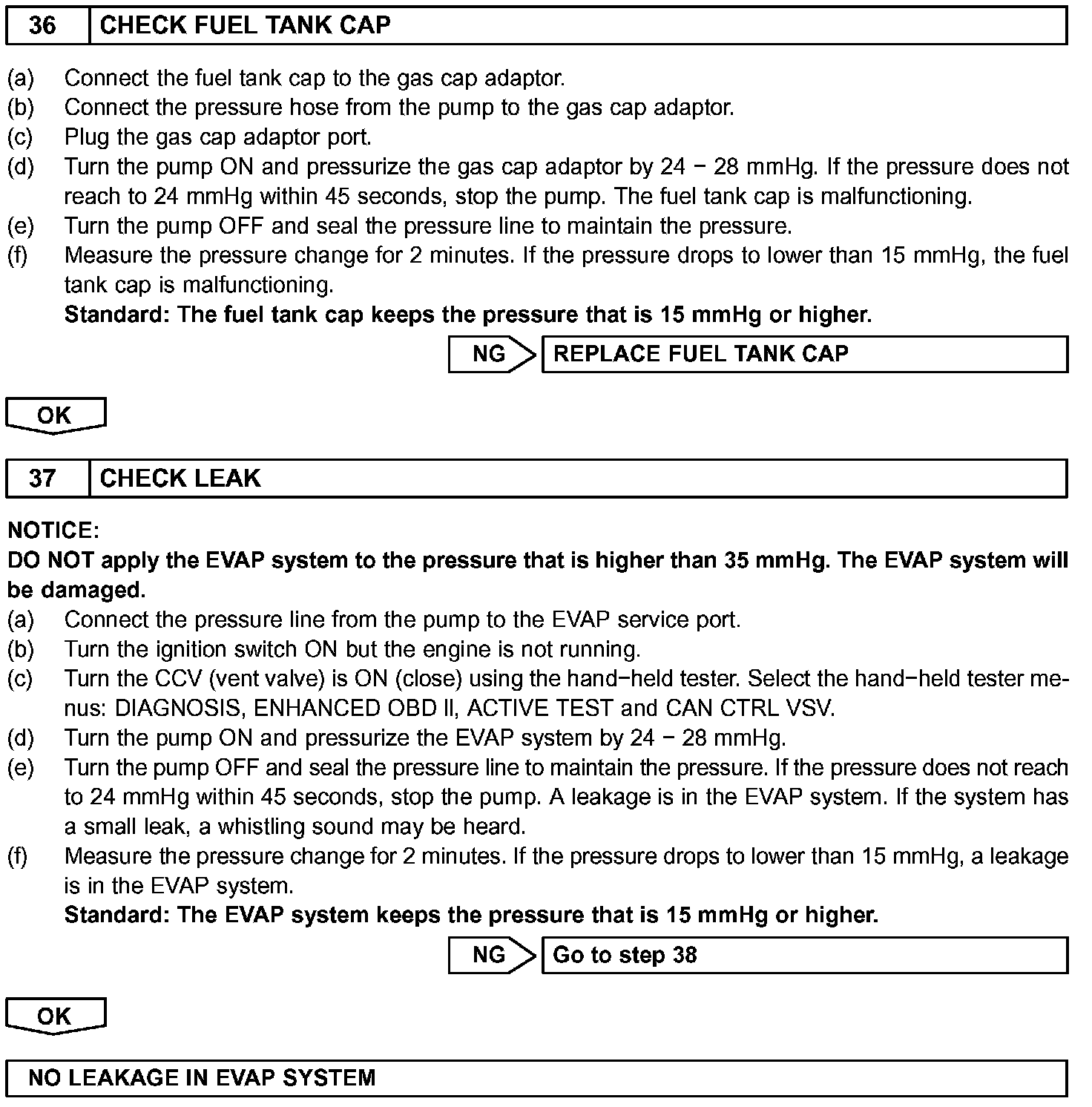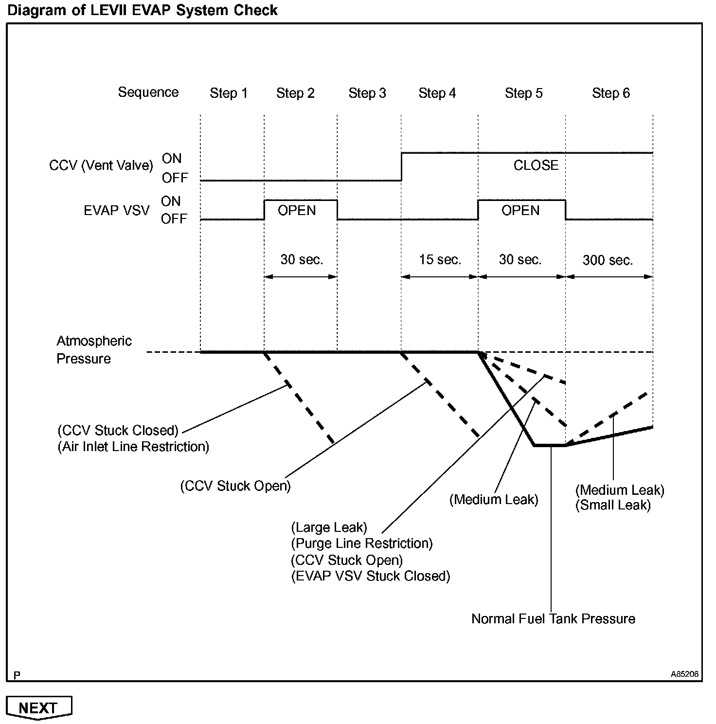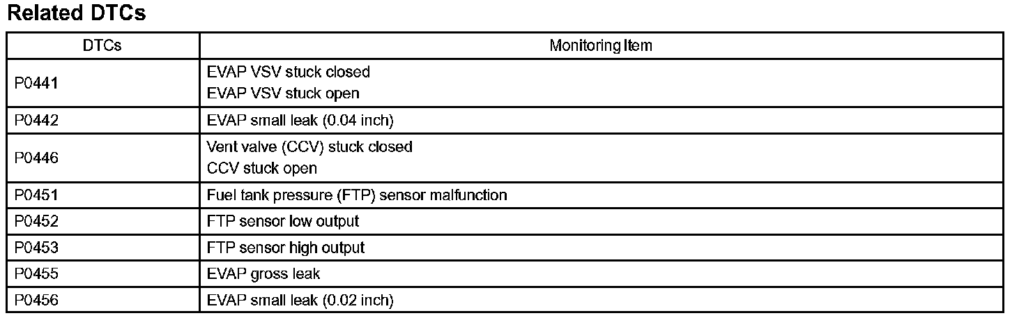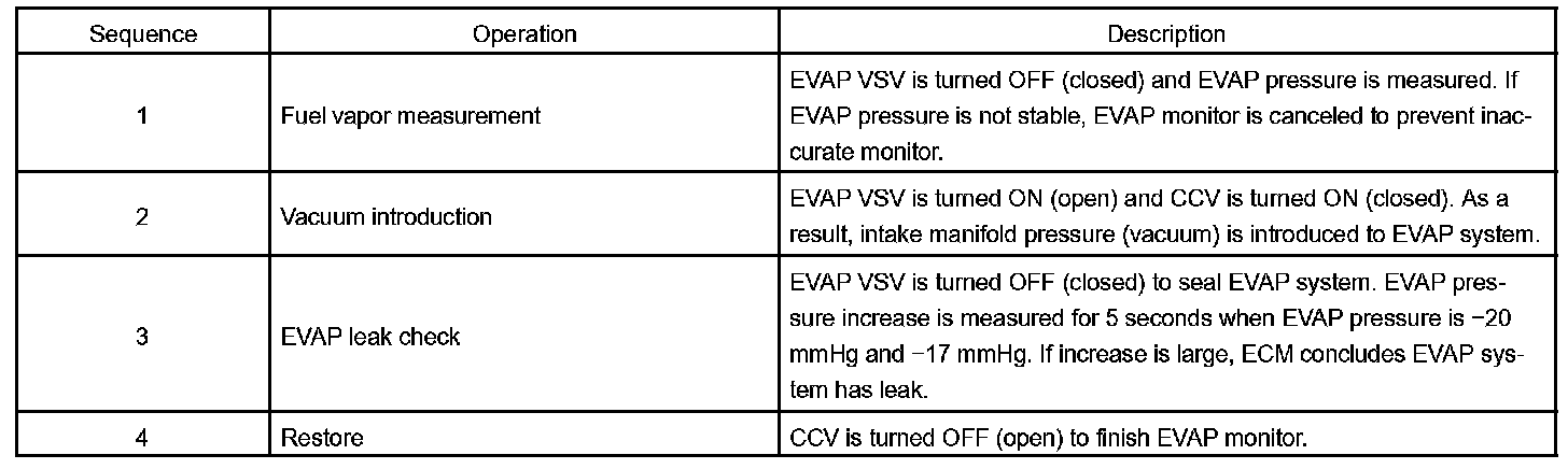 The EVAP monitor's purpose is to check for EVAP leaks and EVAP VSV and CCV malfunctions. The monitor performs the check by first introducing the intake manifold's negative pressure (vacuum) to the EVAP system. Then, the monitor records change in the EVAP system's pressure levels. The monitor runs when the following conditions are met: