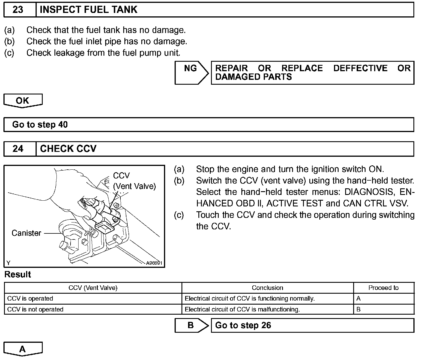 When predetermined conditions (closed loop, etc.) are met, the EVAP VSV is opened and stored fuel vapor in the canister is purged to the intake manifold. The ECM changes duty-cycle to the EVAP VSV to control purge flow volume. Purge flow volume is determined by the intake manifold pressure. Atmospheric pressure is allowed into the canister through the vent valve (CCV) to ensure that purge flow is maintained when negative pressure (vacuum) is applied to the canister. This EVAP system contains given components.