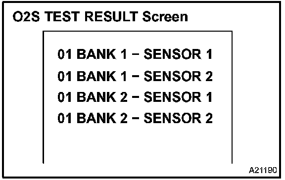 b. On the tester screen, select the following menus: DIAGNOSIS/ CARB OBD II/O2S TEST RESULT. A list of the O2S equipped on the vehicle will be displayed.