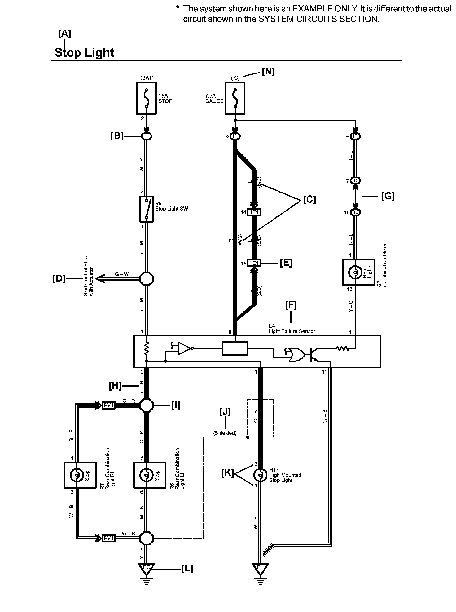 When the ignition SW is turned on and the brake pedal is pressed (Stop light SW on), if the stop light circuit is open, the current flowing from TERMINAL 7 of the light failure sensor to TERMINALS 1, 2 changes, so the light failure sensor detects the disconnection and the warning circuit of the light failure sensor is activated.