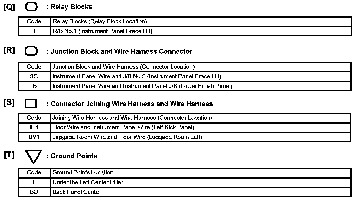 The first letter of the code for each ground point(s) indicates the component's location, e.g, "E" for the Engine Compartment, "I" for the Instrument Panel and Surrounding area, and "B" for the Body and Surrounding area.