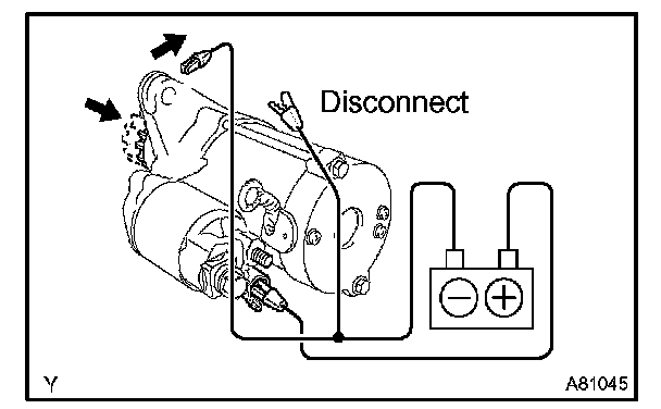1. Maintain the battery connections in step (a), but disconnect the negative (-) lead from terminal C. Check that the pinion gear remains extended.