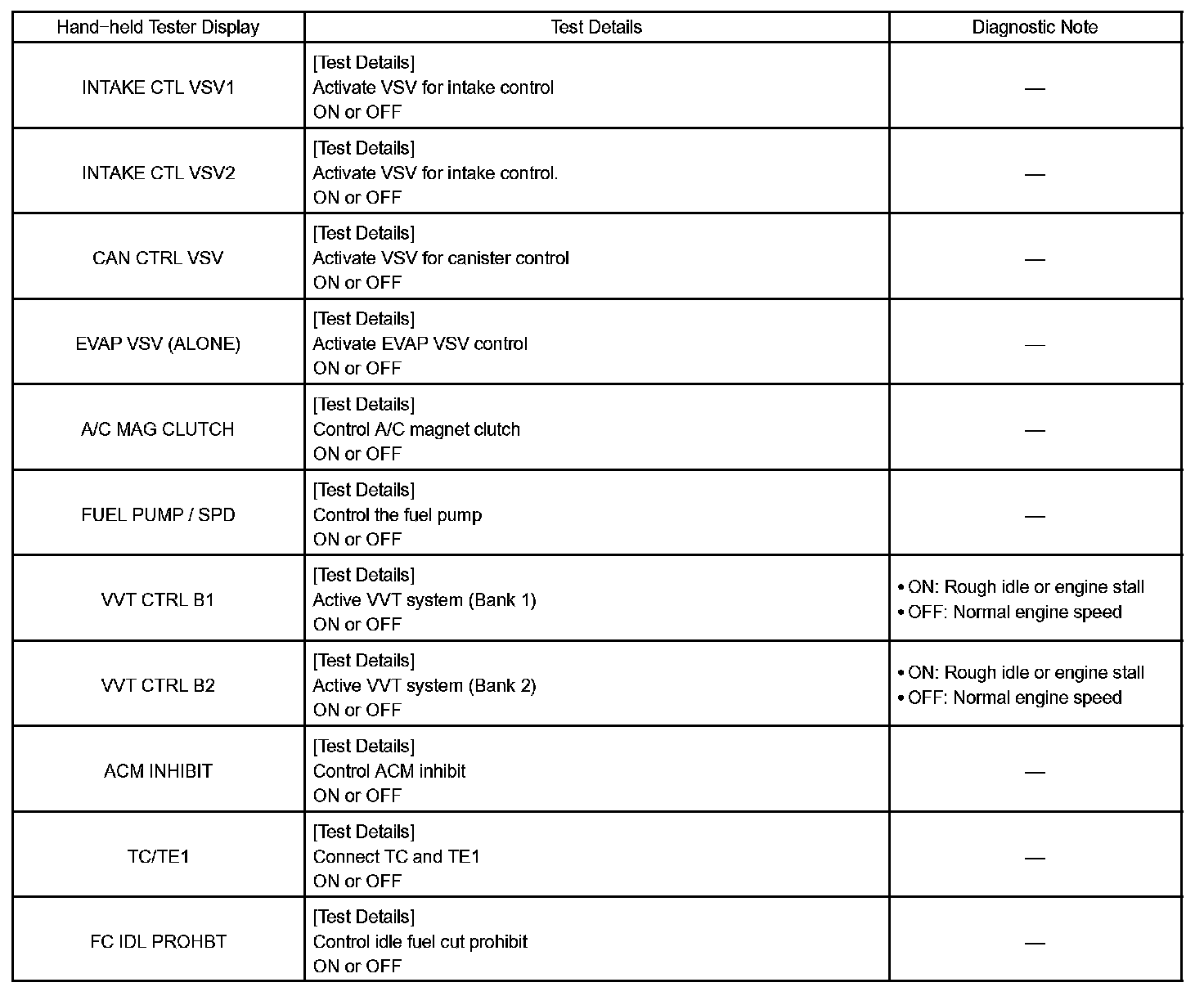 ACTIVE TESTHINT: Performing the hand-held tester ACTIVE TEST allows relay, VSV, actuator and other items to be operated without removing any parts. Performing the ACTIVE TEST early in troubleshooting is one way to shorten labor time. The DATA LIST can be displayed during the ACTIVE TEST.