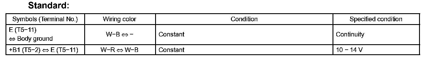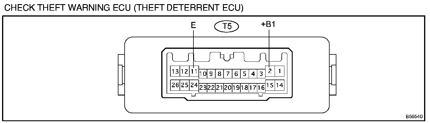 a. Disconnect the T5 theft warning ECU (theft deterrent ECU) connector and check the voltage and continuity of each terminal of the wire harness side connector.