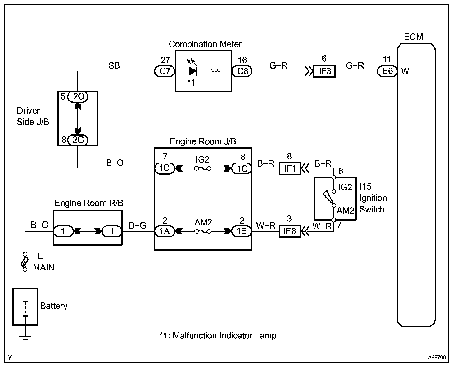 The instrument panel GAUGE fuse provides circuit power and the ECM provides the circuit ground that illuminates the MIL.