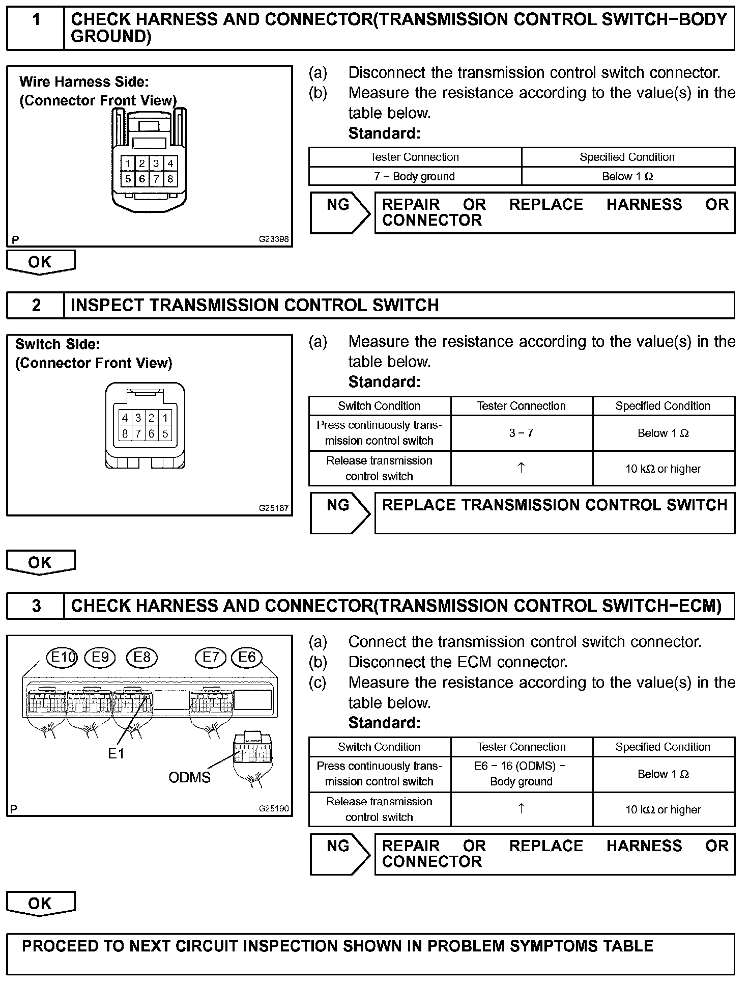 The O/D main switch (transmission control switch) is a momentary type switch. When pressing the O/D main switch, the O/D OFF indicator light lights up and the ECM prohibits shifting into O/D, and when pressing it once again, the O/D OFF indicator light goes off and the ECM allows shifting into O/D. Turning the IG switch OFF will reset the O/D OFF indicator light.