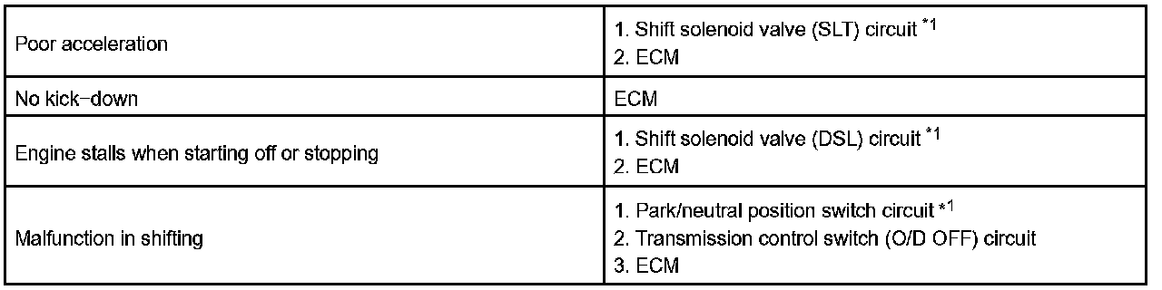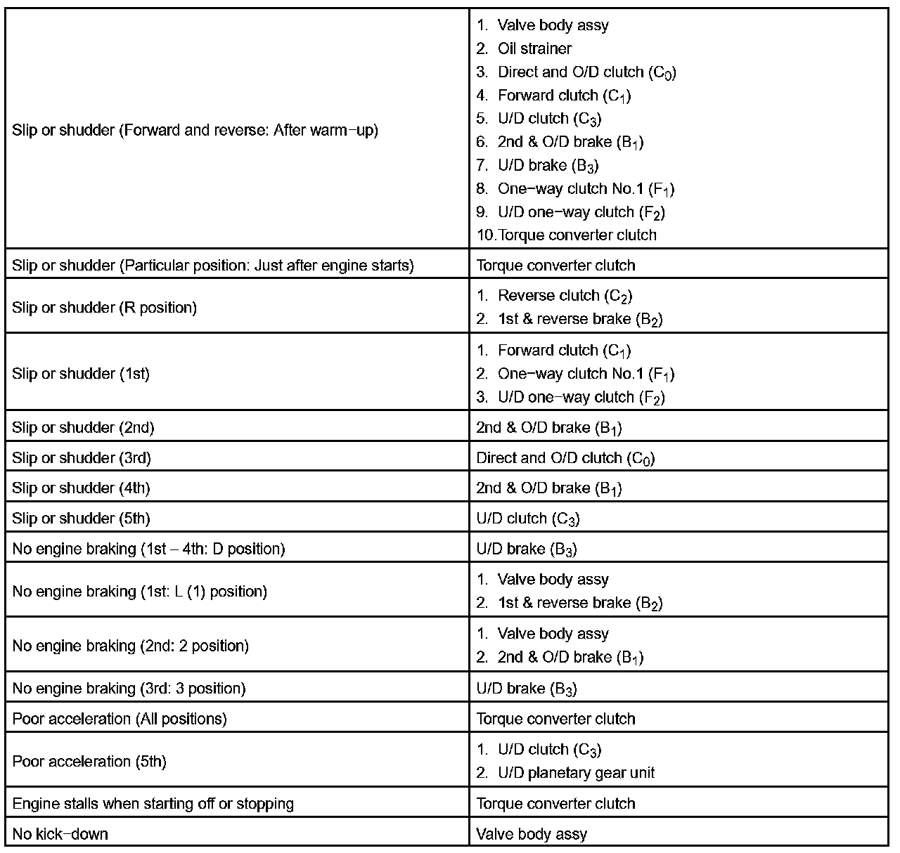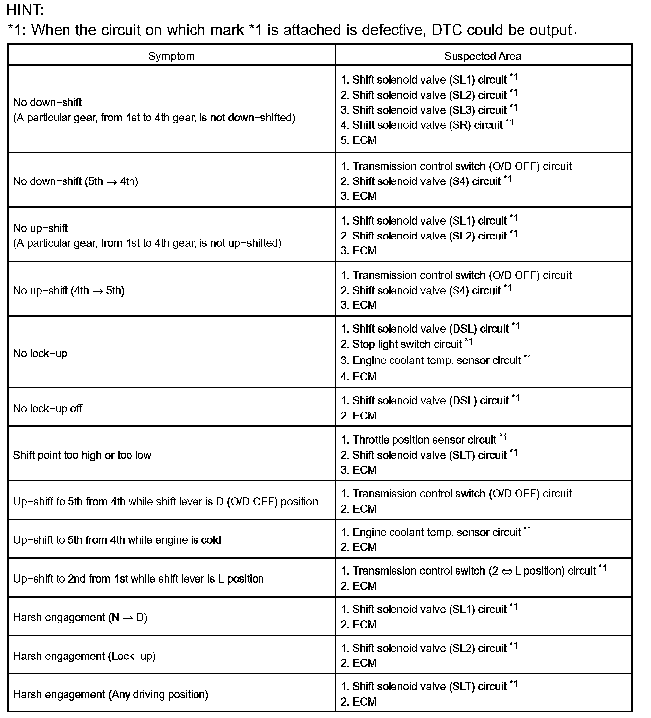 PROBLEM SYMPTOMS TABLEHINT: If a normal code is displayed during the diagnostic trouble code check although the trouble still occurs, check the electrical circuits for each symptom in the order given in the charts and proceed to the troubleshooting.