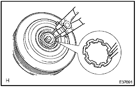 f. Using a snap ring expander, remove the snap ring and magnet clutch stator.