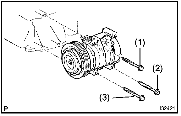 NOTE: Tighten the bolts in following order shown in the illustration to install the compressor and magnetic clutch.
