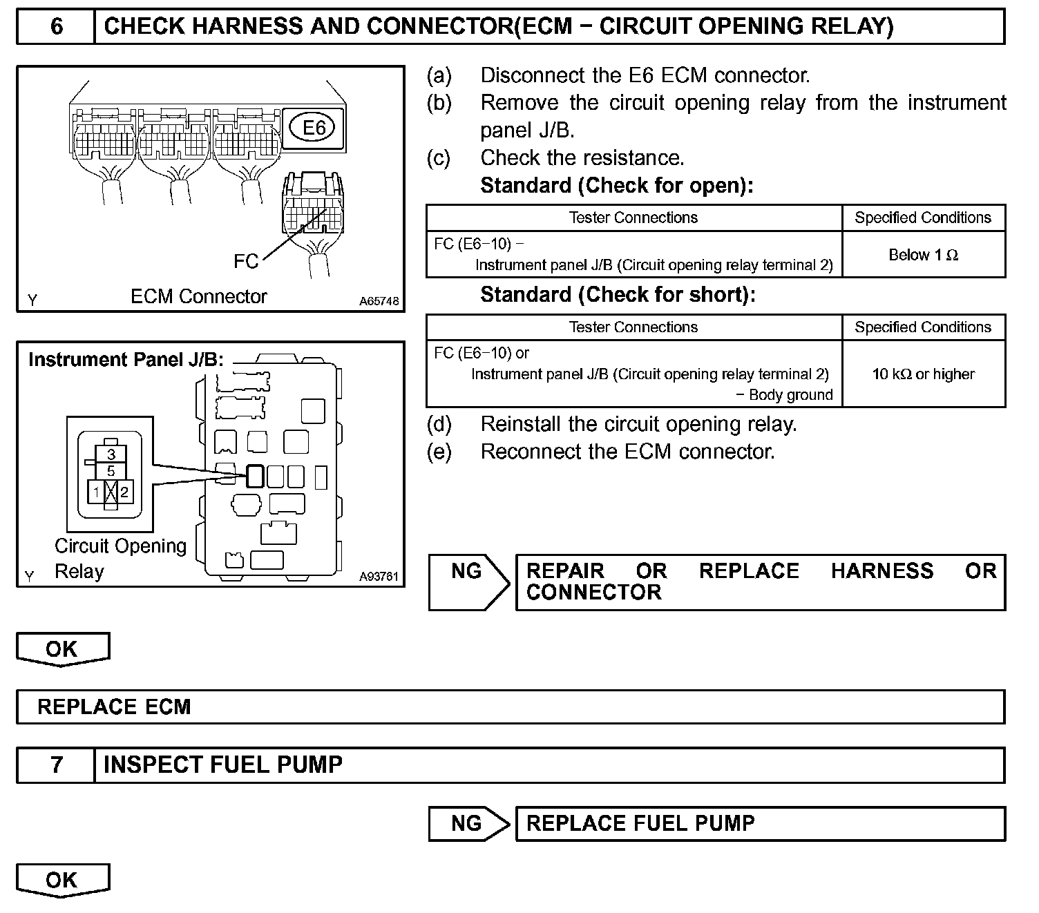 When the STA and NE signals are received by the ECM, Tr (power transistor) is switched on, allowing a current to flow into the circuit opening relay coil. The circuit opening relay switches on, power is supplied to the fuel pump and the fuel pump operates.