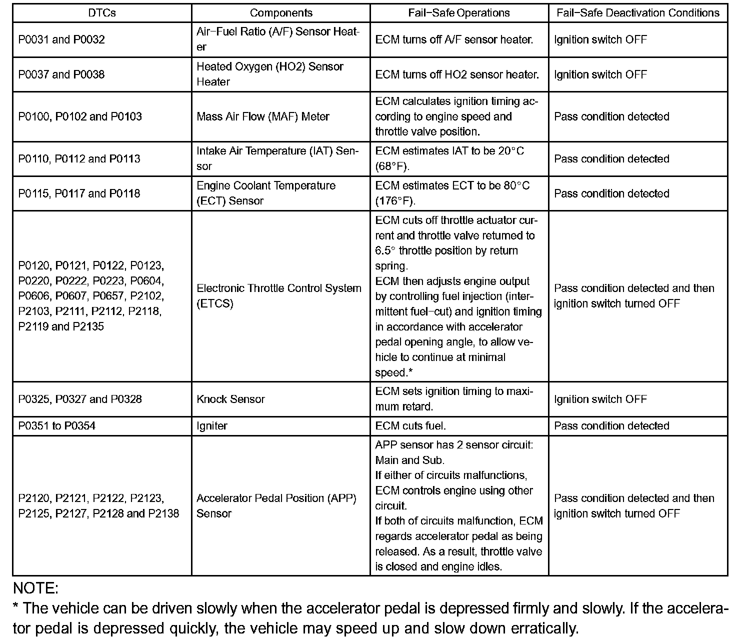 If any of the following DTCs are set, the ECM enters fail-safe mode to allow the vehicle to be driven temporarily.