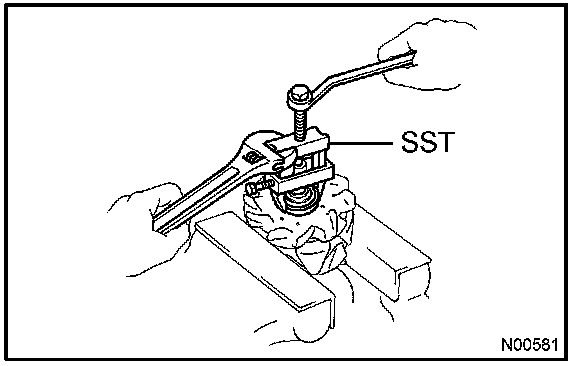 d. To loosen the pulley nut, turn SST 1-A in the direction shown in the illustration.