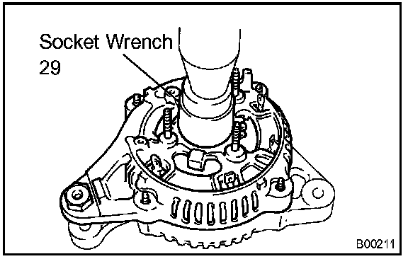 a. Using a socket wrench 29 and a press, slowly push in the generator rectifier end frame.