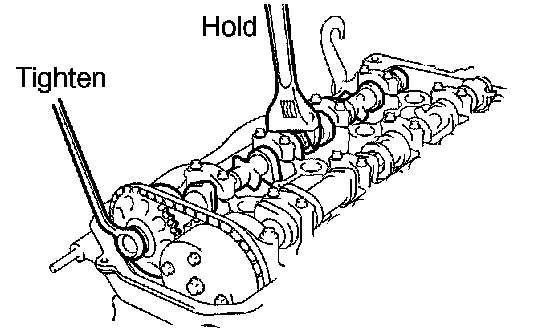 g. Hold the hexagonal lobe of the camshaft, then tighten the camshaft timing gear set bolt.
