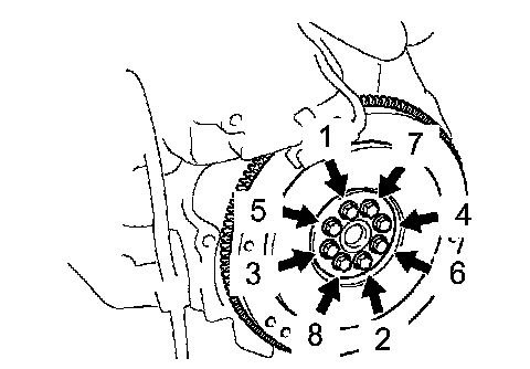 Using several steps, uniformly install and tighten the 8 bolts in the sequence shown in the illustration.