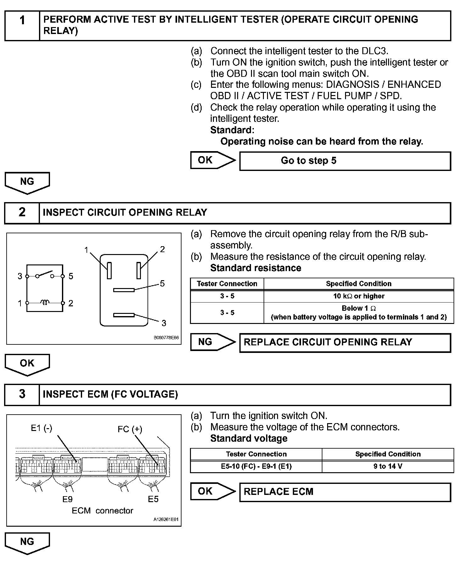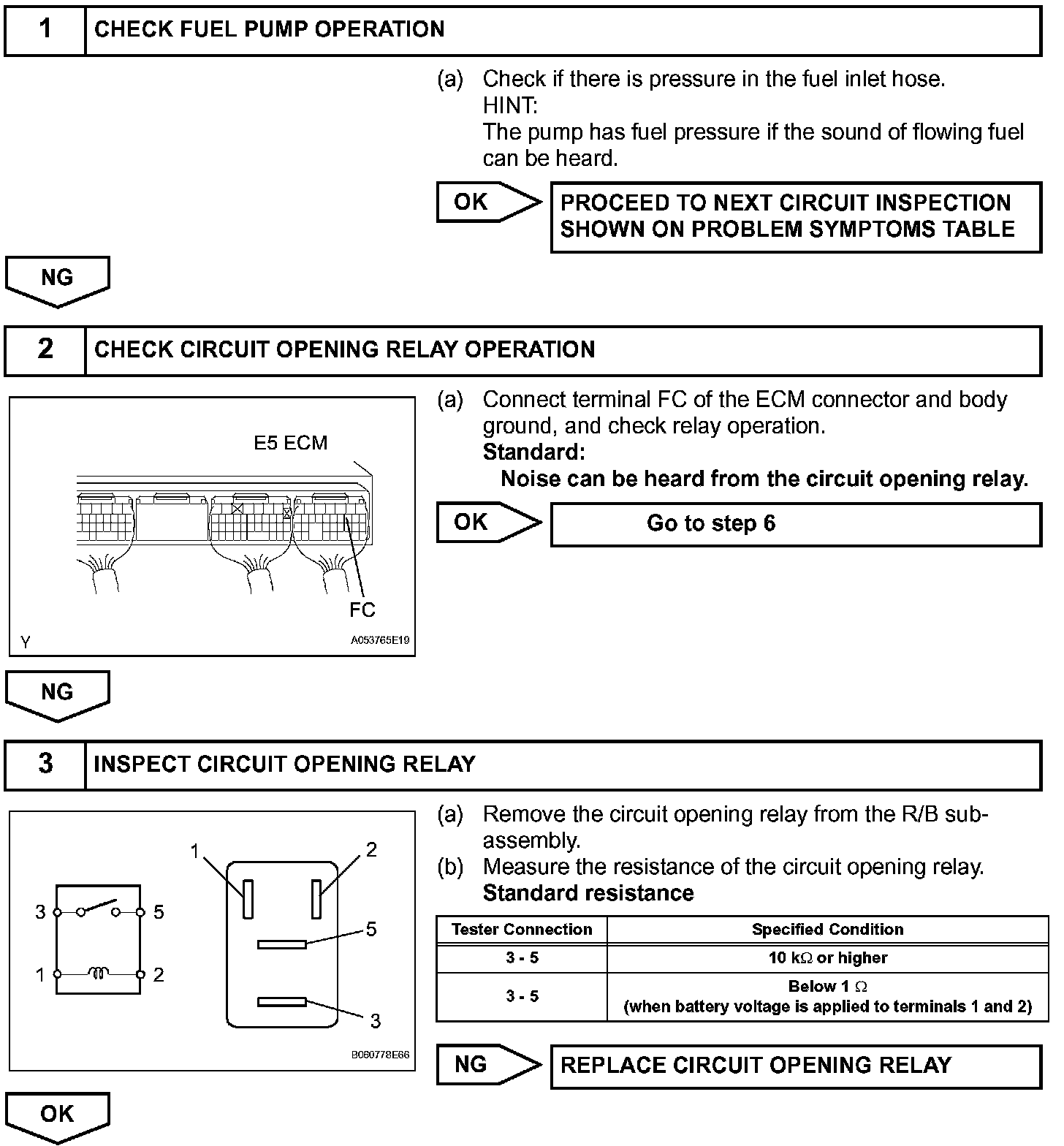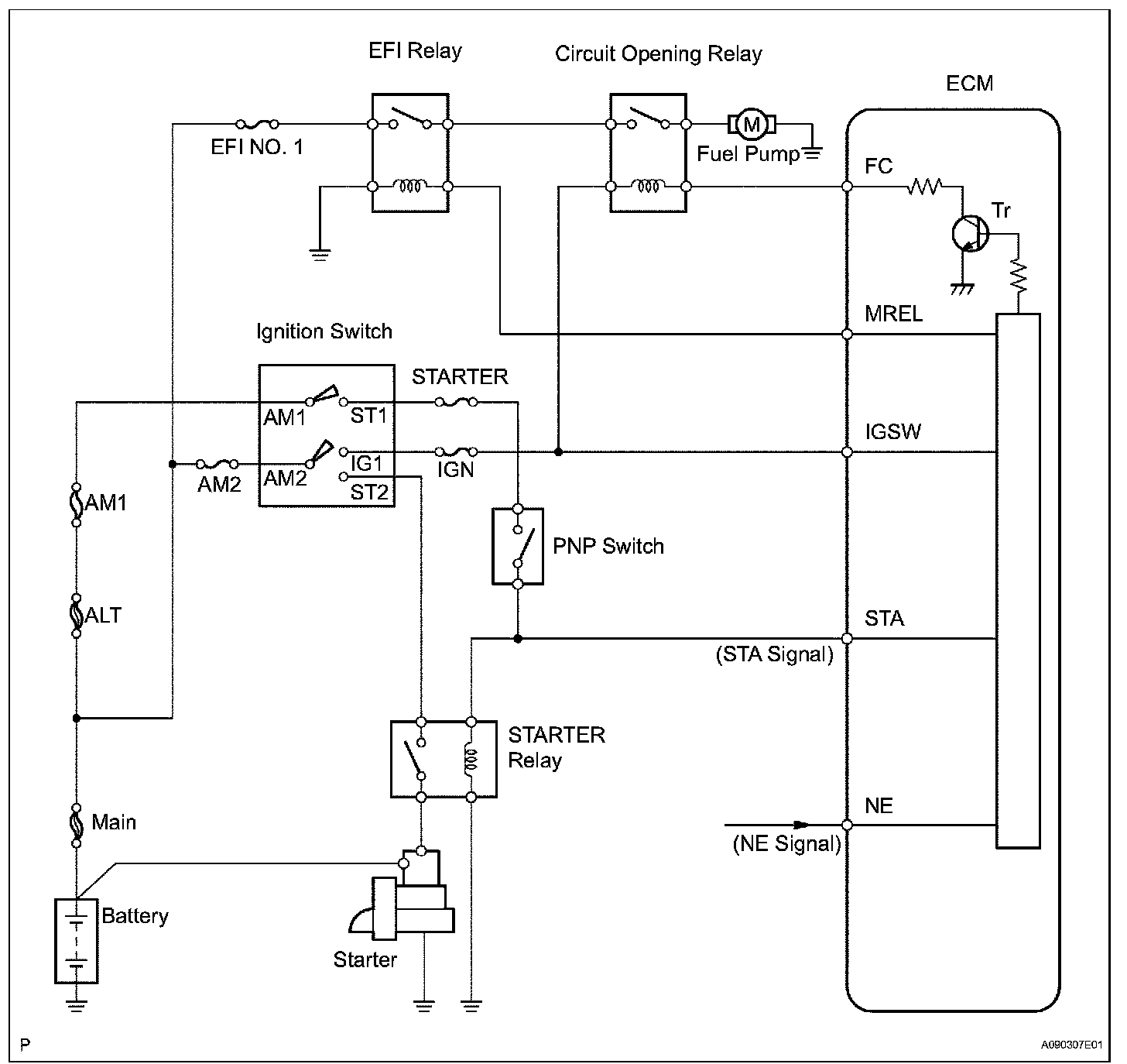 When the STA signal and NE signal are input to the ECM, Tr is turned ON, current flows to coil of the circuit opening relay (Marking), the relay switches ON, power is supplied to the fuel pump and the fuel pump operates.
