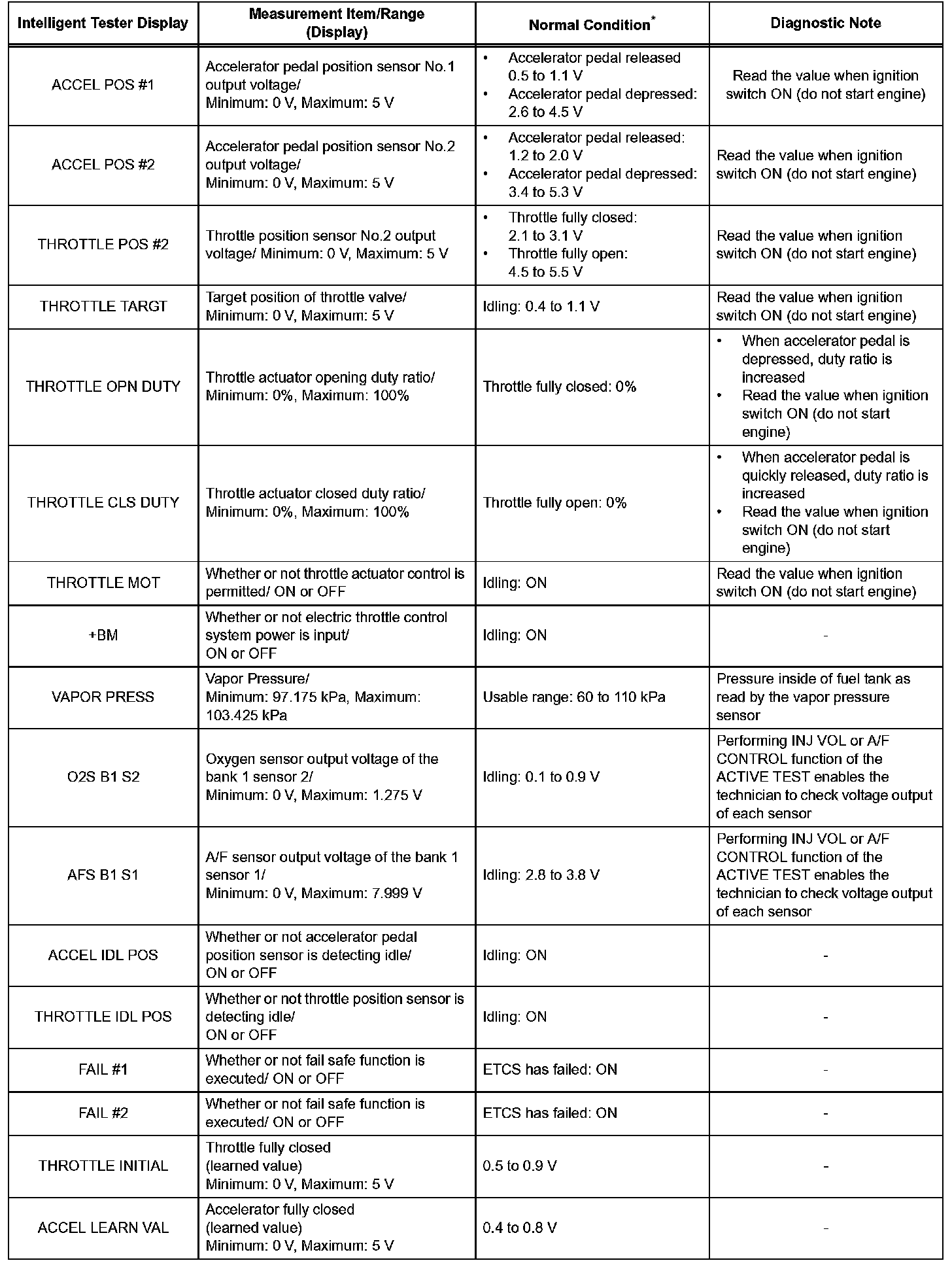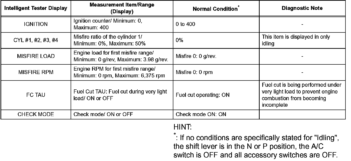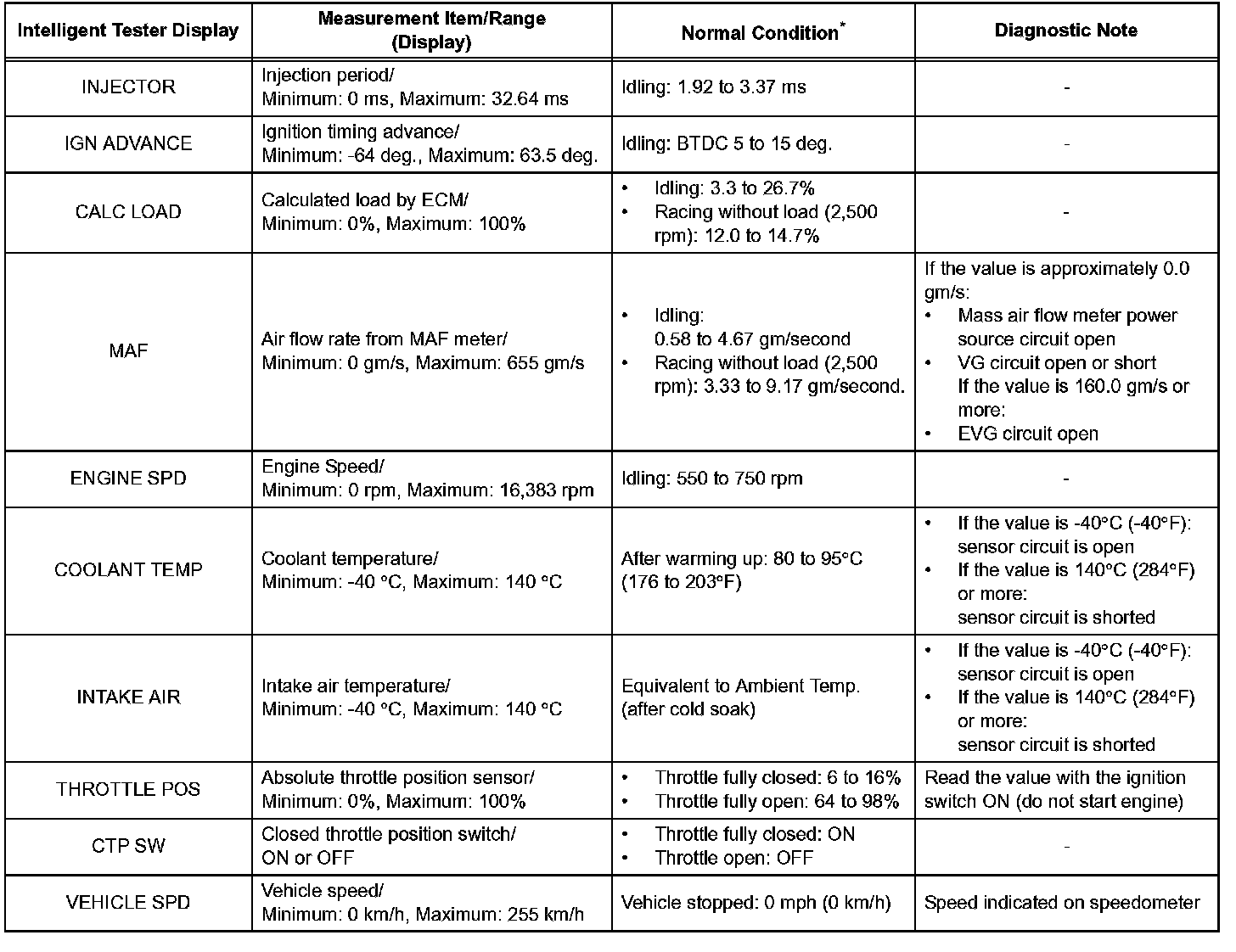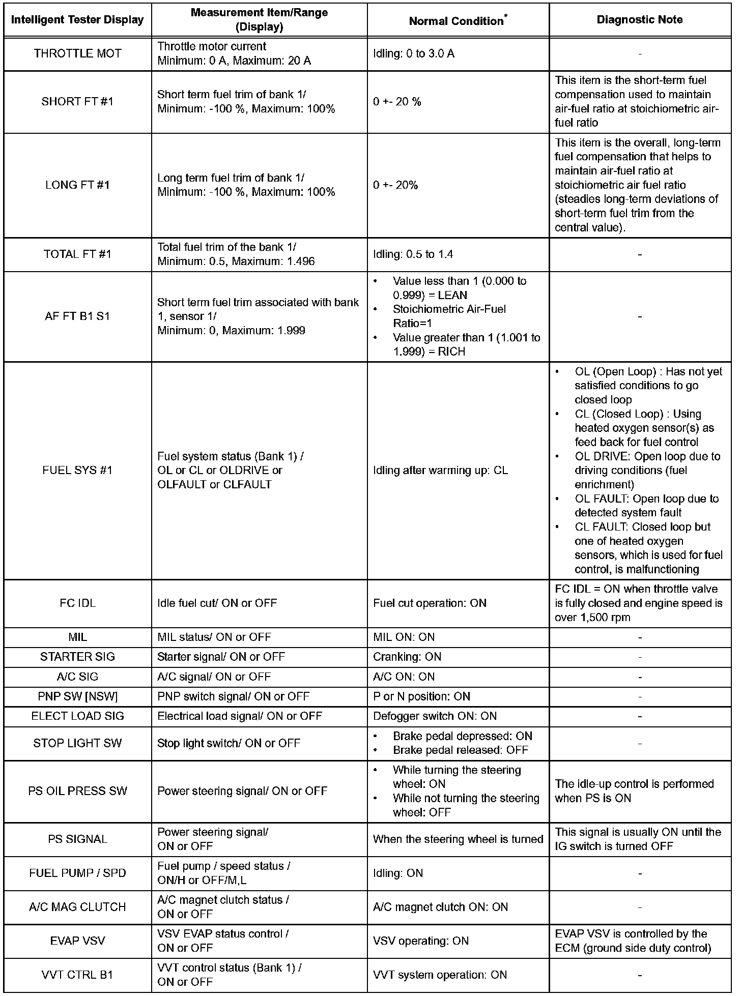 DATA LISTHINT: Using the intelligent tester's DATA LIST allows switch, sensor, actuator and other item values to be read without removing any parts. Reading the DATA LIST early in troubleshooting is one way to shorten labor time