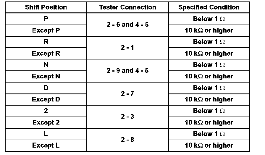 c. Measure the resistance according to the value(s) in the table when the shift lever is moved to each position.