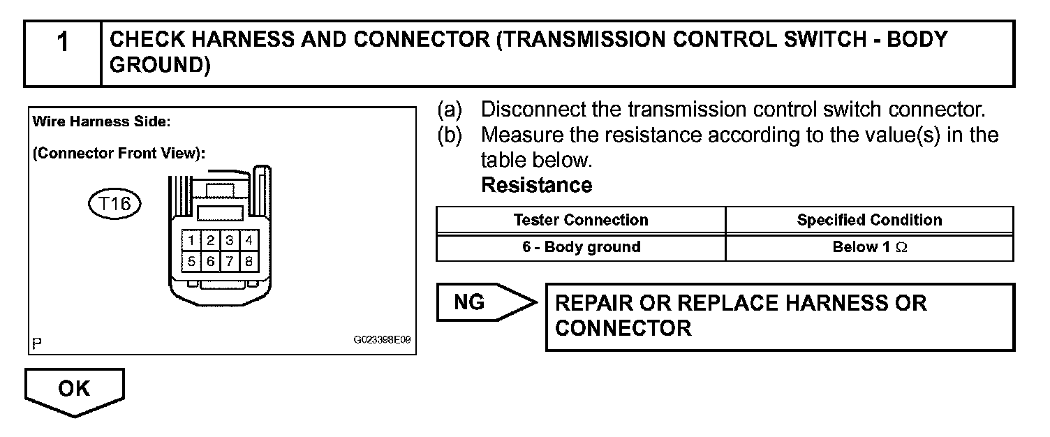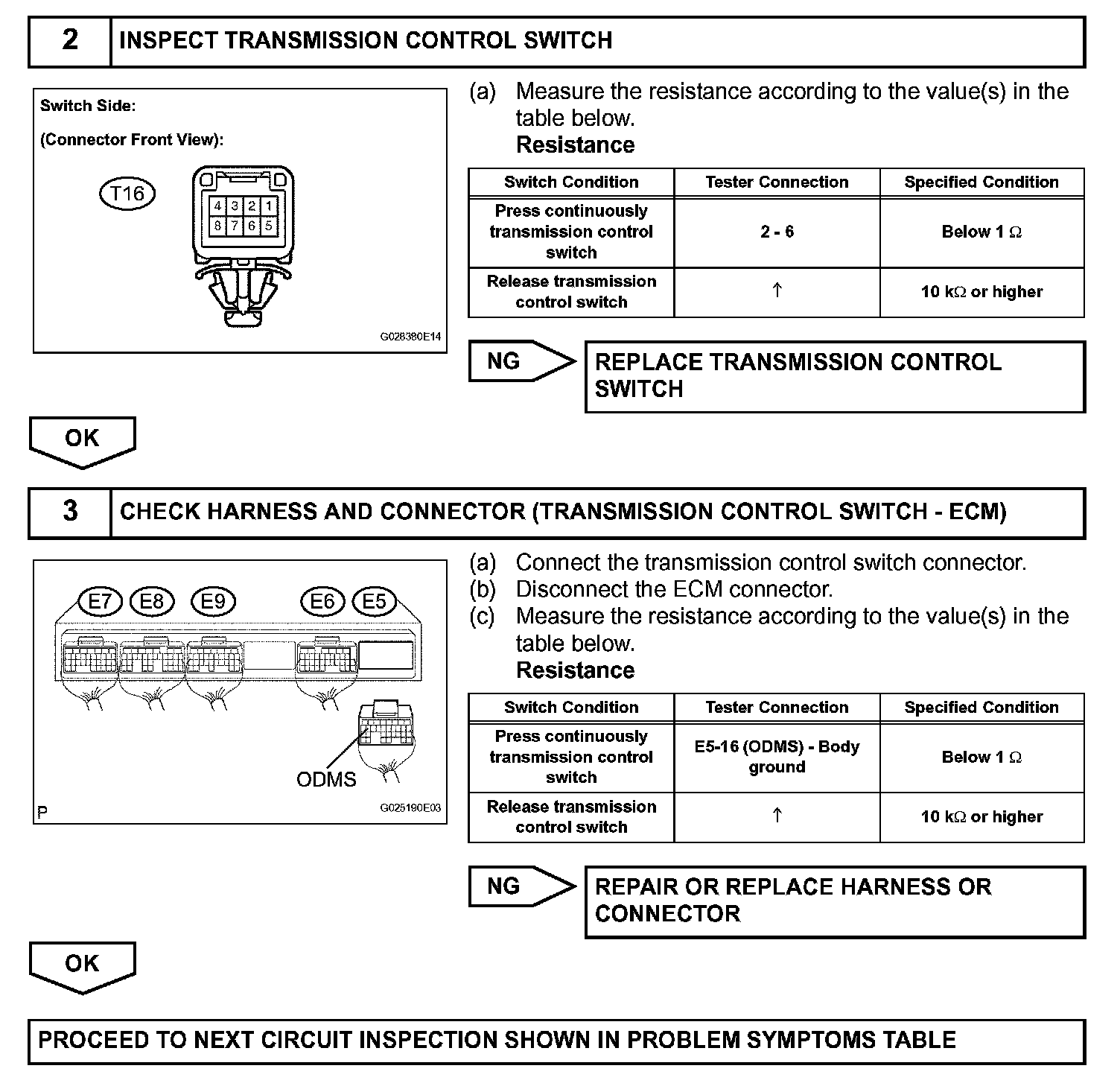 The O/D main switch (transmission control switch) is a momentary type switch. When pressing the O/D main switch, the O/D OFF indicator light lights up and the ECM prohibits shifting into O/D, and when pressing it once again, the O/D OFF indicator light goes off and the ECM allows shifting into O/D. Turning the IG switch OFF will reset the O/D OFF indicator light.