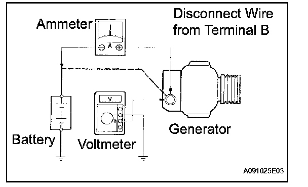 1. Disconnect the wire from terminal B of the generator and connect it to the negative (-) lead of the ammeter.