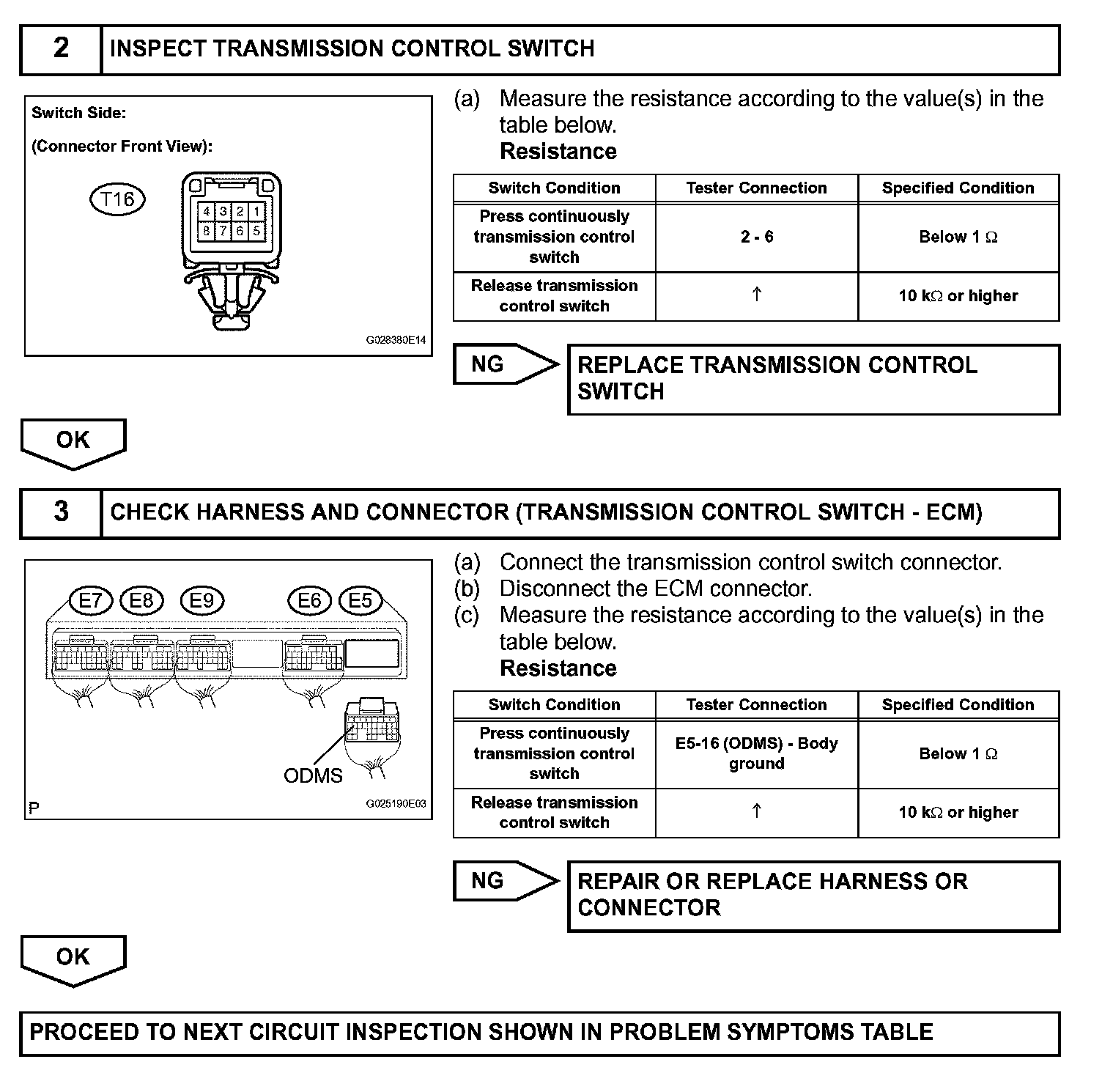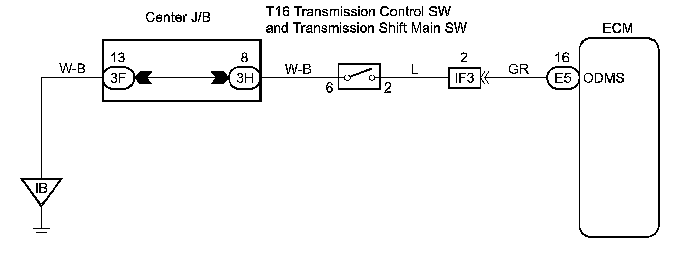 The O/D main switch (transmission control switch) is a momentary type switch. When pressing the O/D main switch, the O/D OFF indicator light lights up and the ECM prohibits shifting into O/D, and when pressing it once again, the O/D OFF indicator light goes off and the ECM allows shifting into O/D. Turning the IG switch OFF will reset the O/D OFF indicator light.