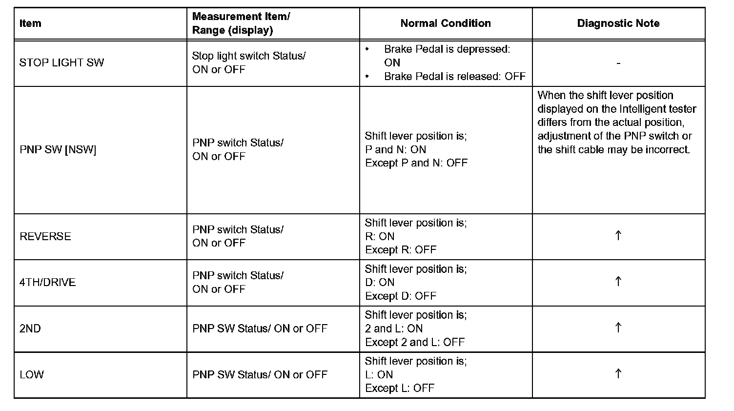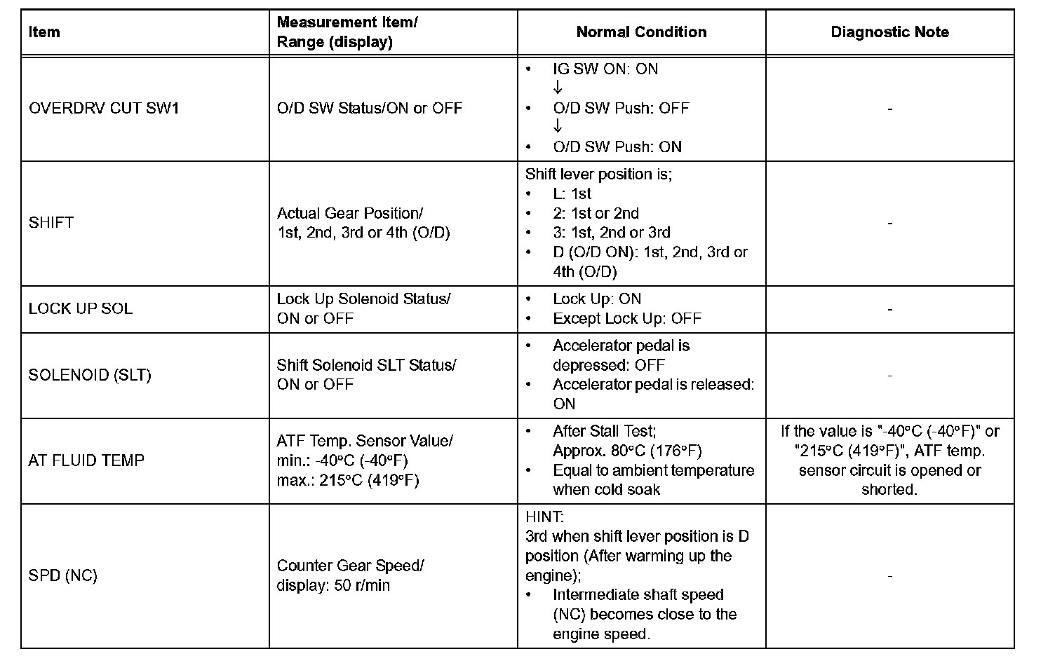 HINT: According to the DATA LIST displayed by the intelligent tester, you can read the value of the switch, sensor, actuator and so on without parts removal. Reading the DATA LIST as the first step of troubleshooting is one method to shorten labor time.