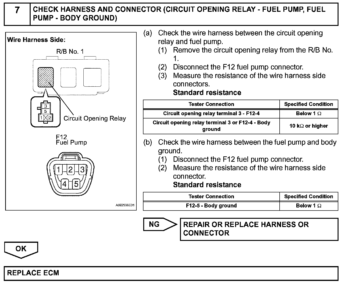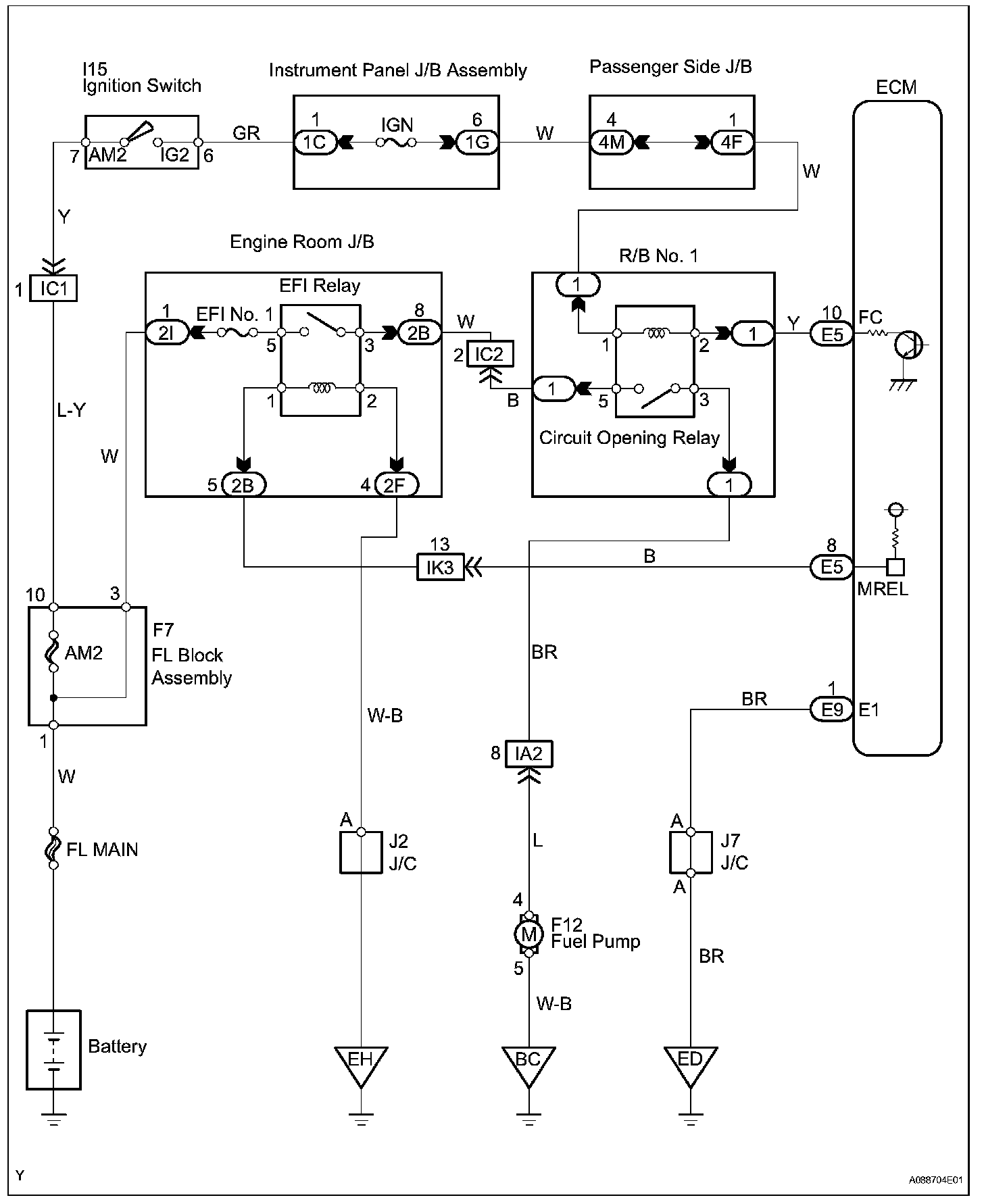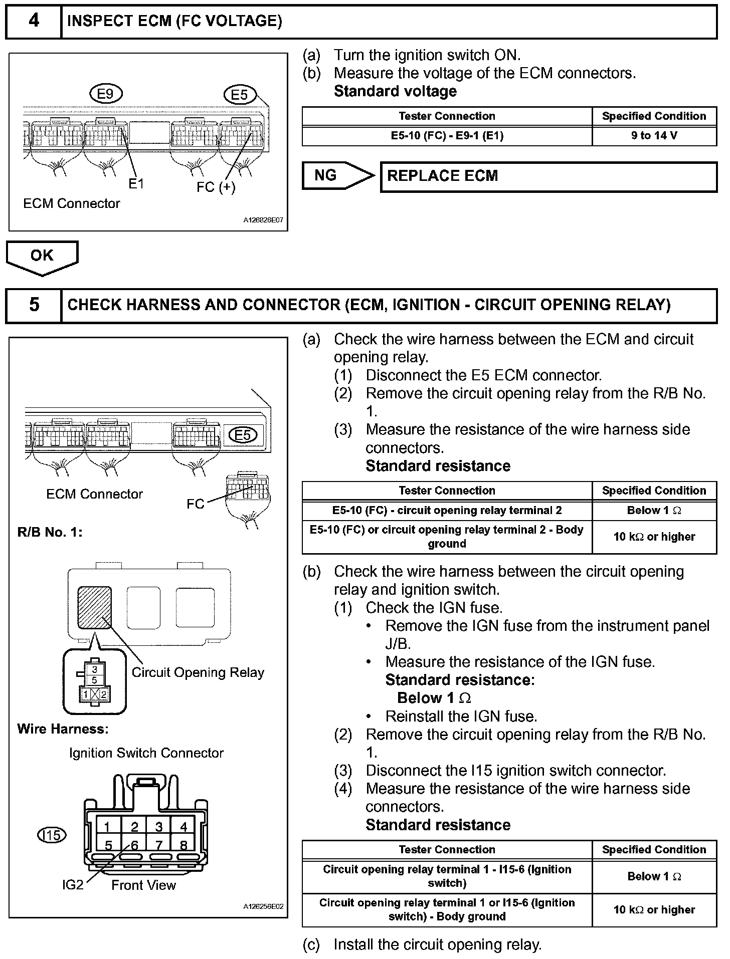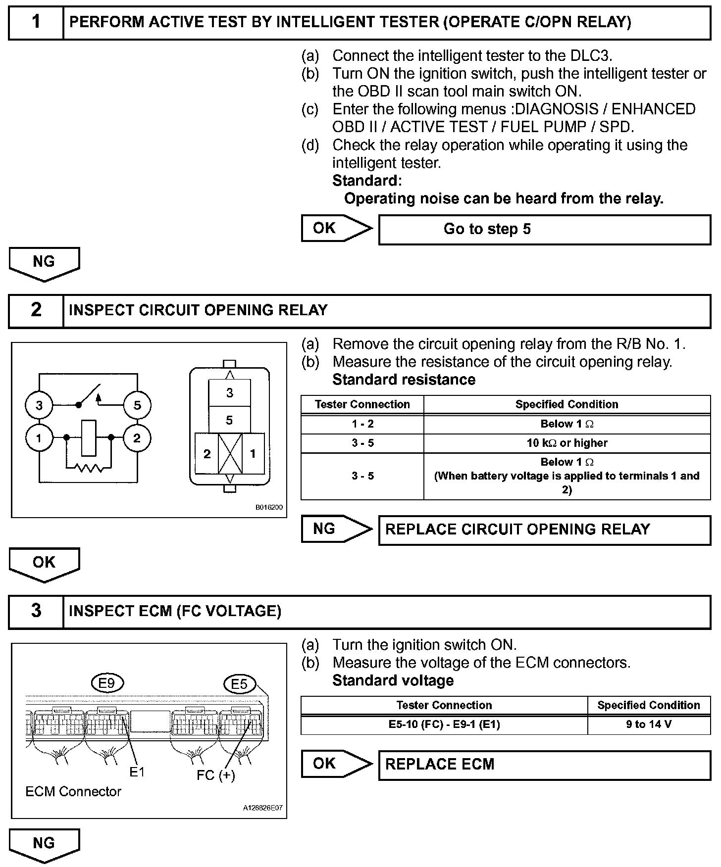 When the STA signal and NE signal are input to the ECM, Tr is turned ON, current flows to coil of the circuit opening relay the relay switches ON, power is supplied to the fuel pump and the fuel pump operates.