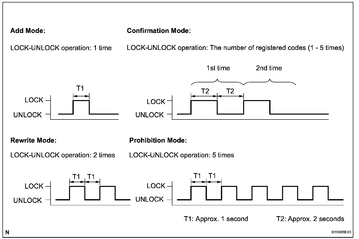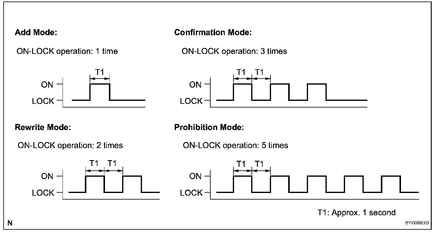 - Add mode is used to register new recognition codes while still retaining codes already registered. This mode is used when a new transmitter is added. If the number of registered codes exceeds 4, the previously registered codes will be erased in order, starting from the first registered code.