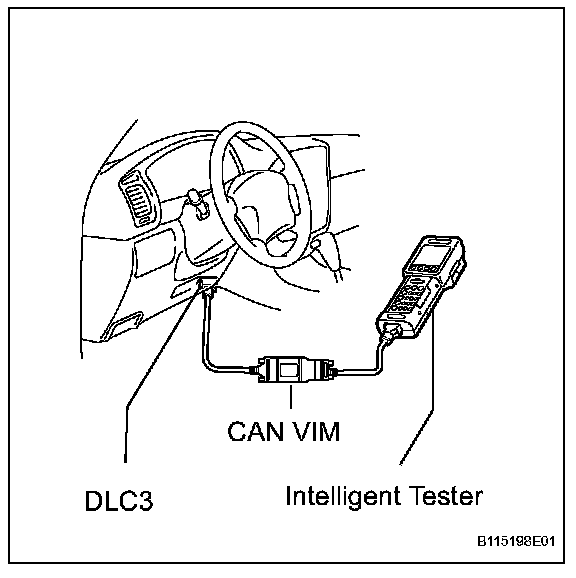 HINT: Connect the cable of the intelligent tester (with CAN VIM) to the DLC3, turn the ignition switch ON and attempt to use the tester. If the display indicates that a communication error has occurred, there is a problem either with the vehicle or with the tester.