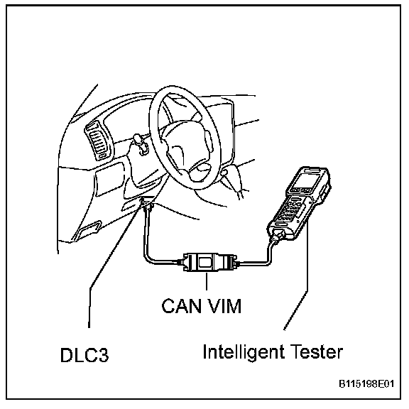 HINT: Connect the cable of the intelligent tester (with CAN VIM) to the DLC3, turn the ignition switch ON and attempt to use the tester. If the display indicates that a communication error has occurred, there is a problem either with the vehicle or with the tester.