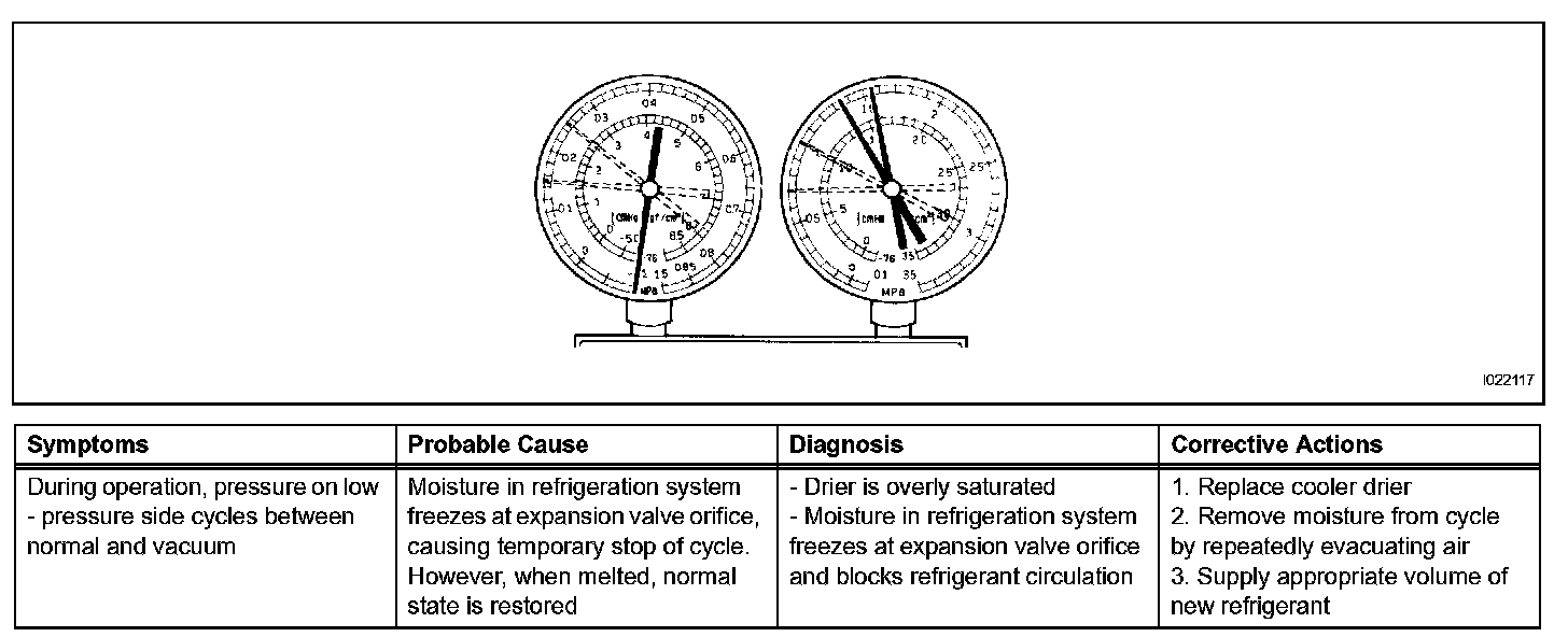 2. The A/C system periodically changes between normal and improper function due to moisture in the refrigerant system.
