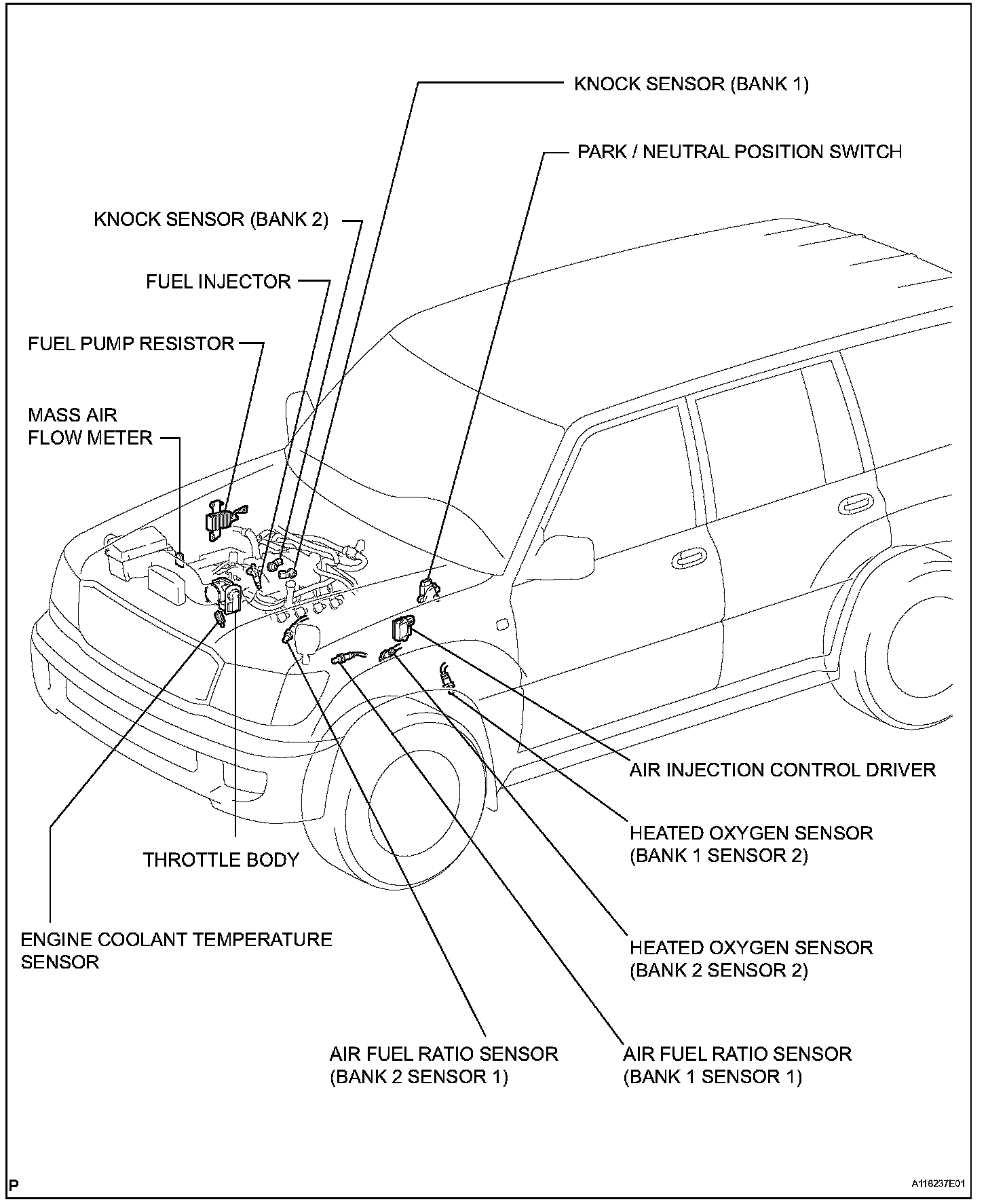 The Intake Air Temperature (IAT) Sensor is installed in the Mass Air Flow (MAF) Meter.