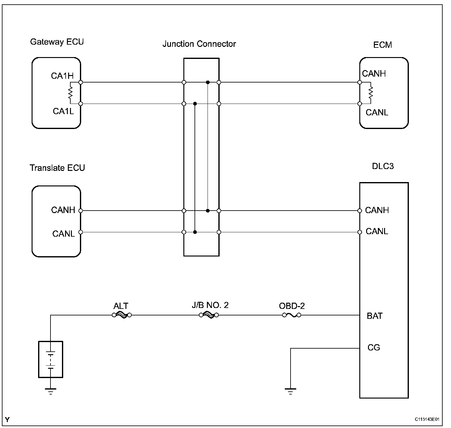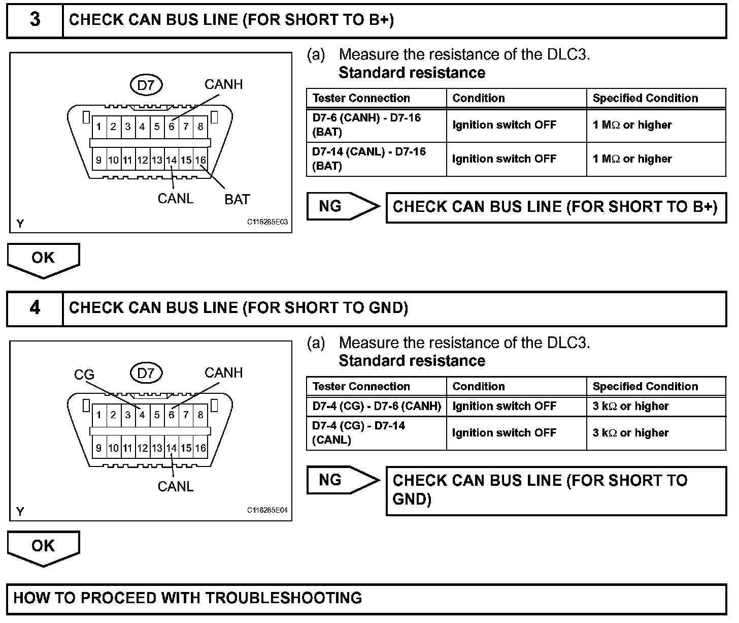 When any DTC for the CAN communication system is output, first measure the resistance between the terminals of the DLC3 to specify the trouble area, and check that there is no short in the CAN main bus line, between the CAN bus lines, to B+, or to GND.