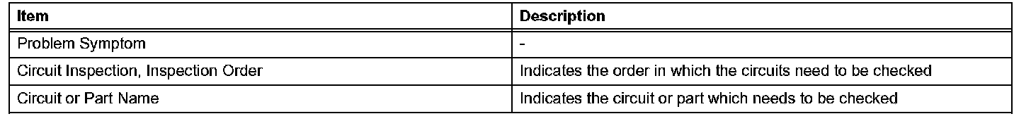 PROBLEM SYMPTOMS TABLEWhen a "Normal" code is output during a DTC check but the problem is still occurring, use the Problem Symptoms Table. The suspected areas (circuits or parts) for each problem symptom are in the table. The suspected areas are listed in order of probability. A description of each of the chart's columns are as mentioned.
