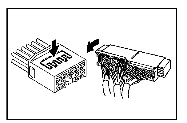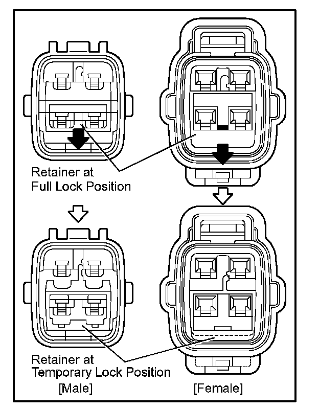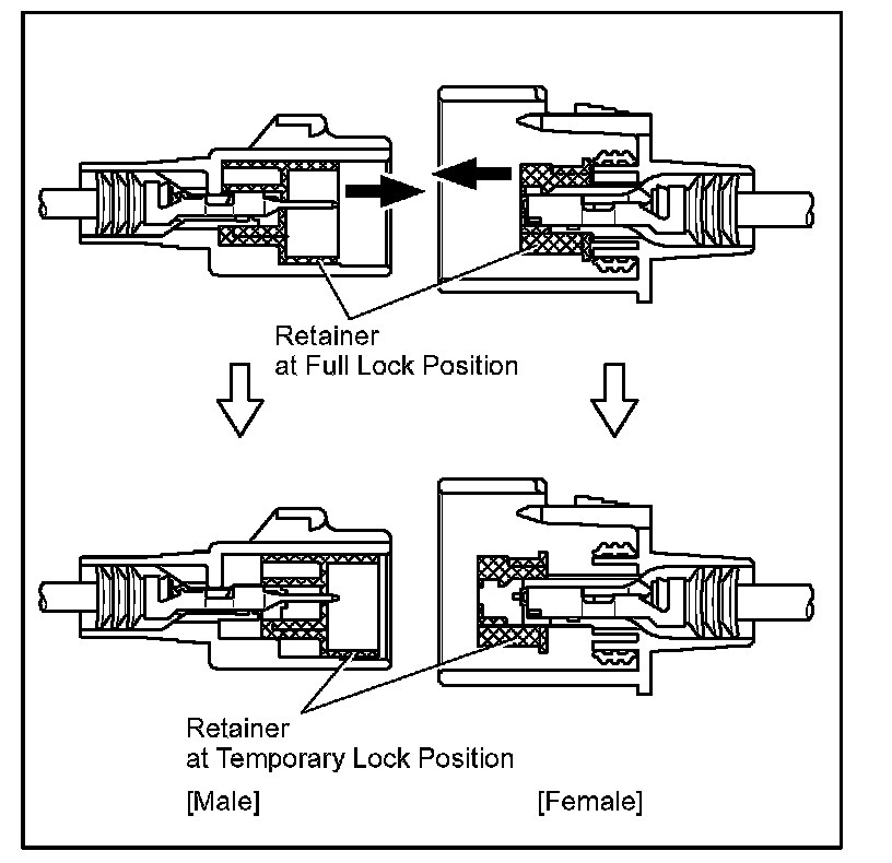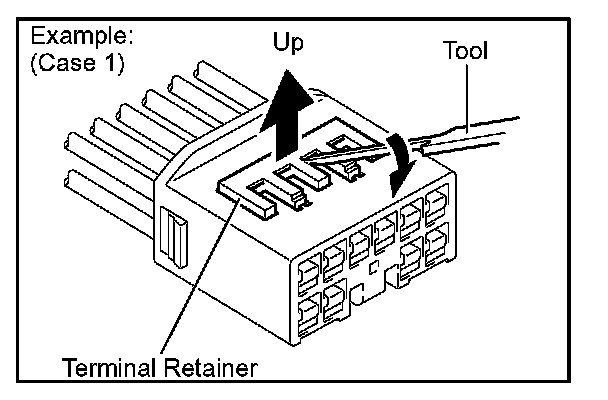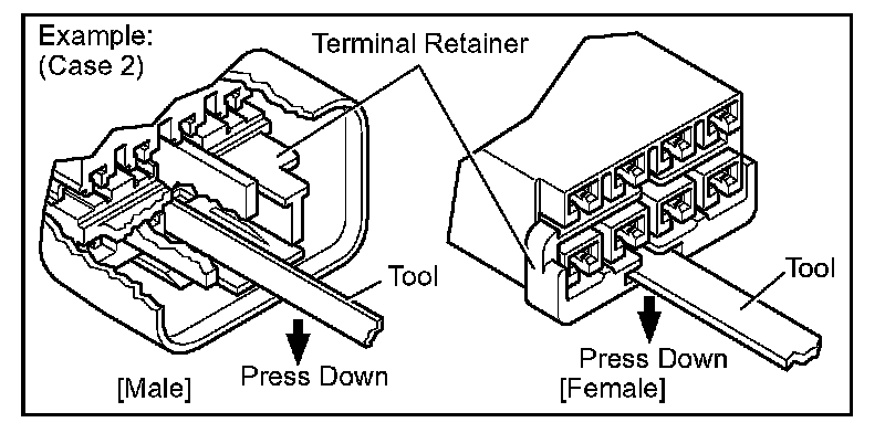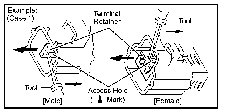 Insert the special tool into the terminal retainer access hole (/\ Mark) and pull the terminal retainer up to the temporary lock position.