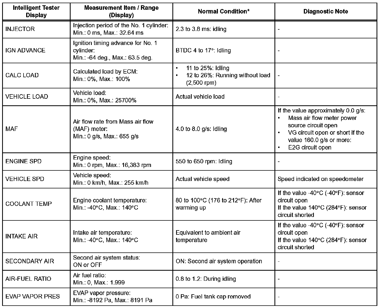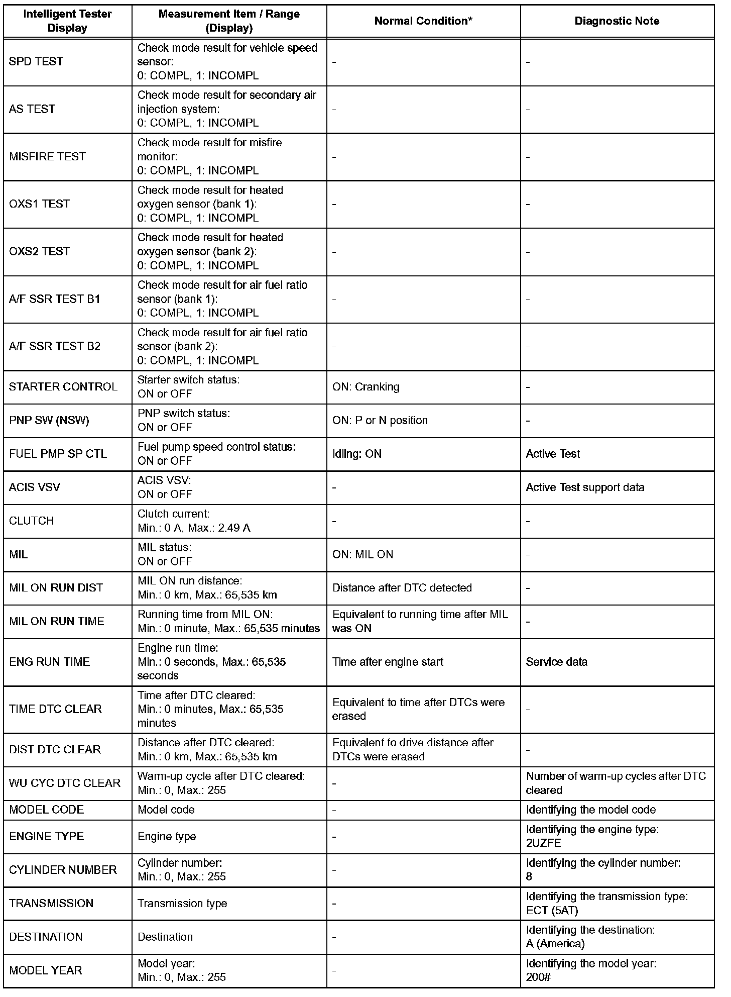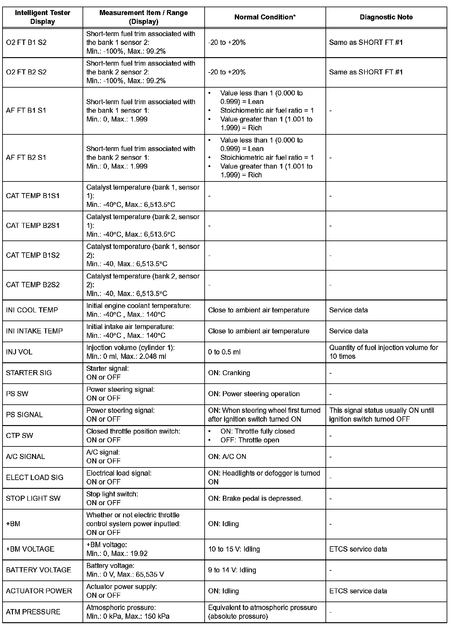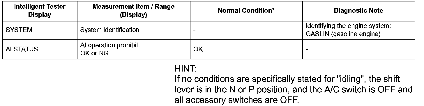 DATA LISTHINT: Using the intelligent tester's DATA LIST allows switch, sensor, actuator and other item values to be read without removing any parts. Reading the DATA LIST early in troubleshooting is one way to save time.