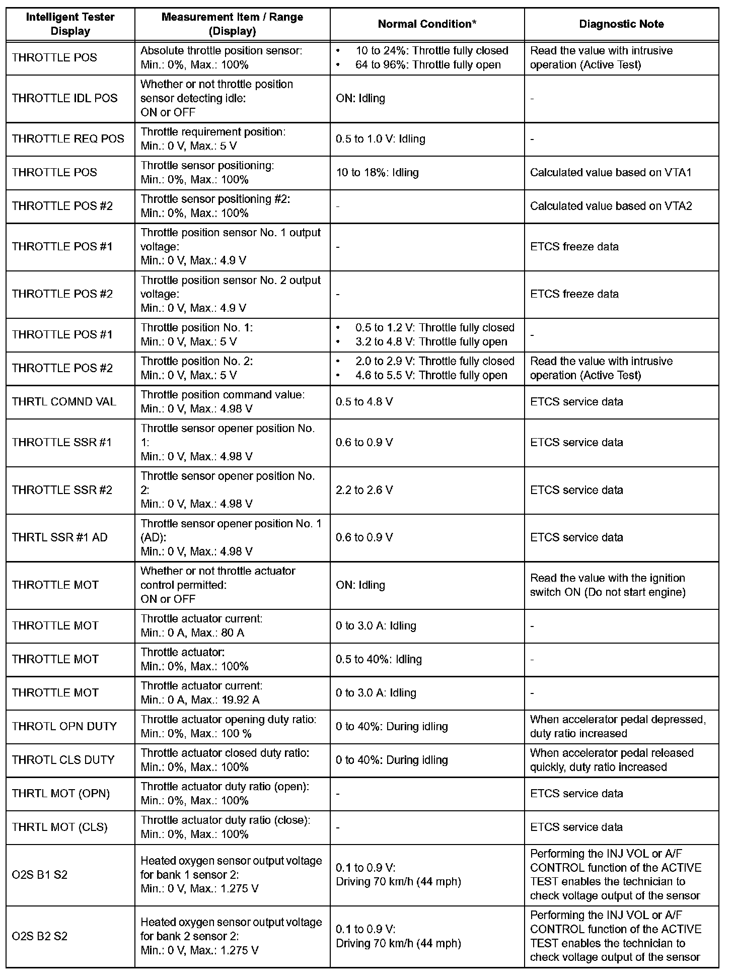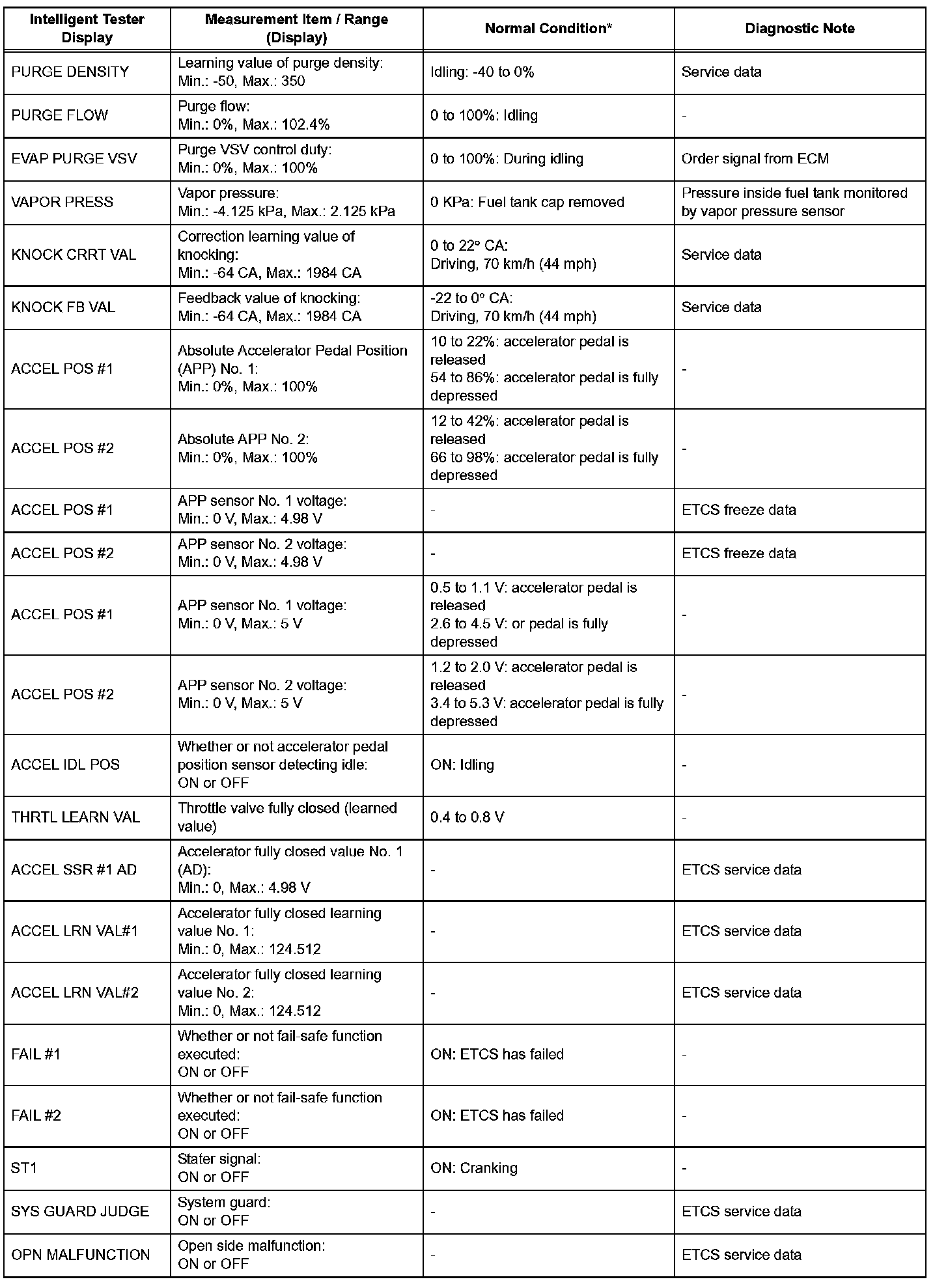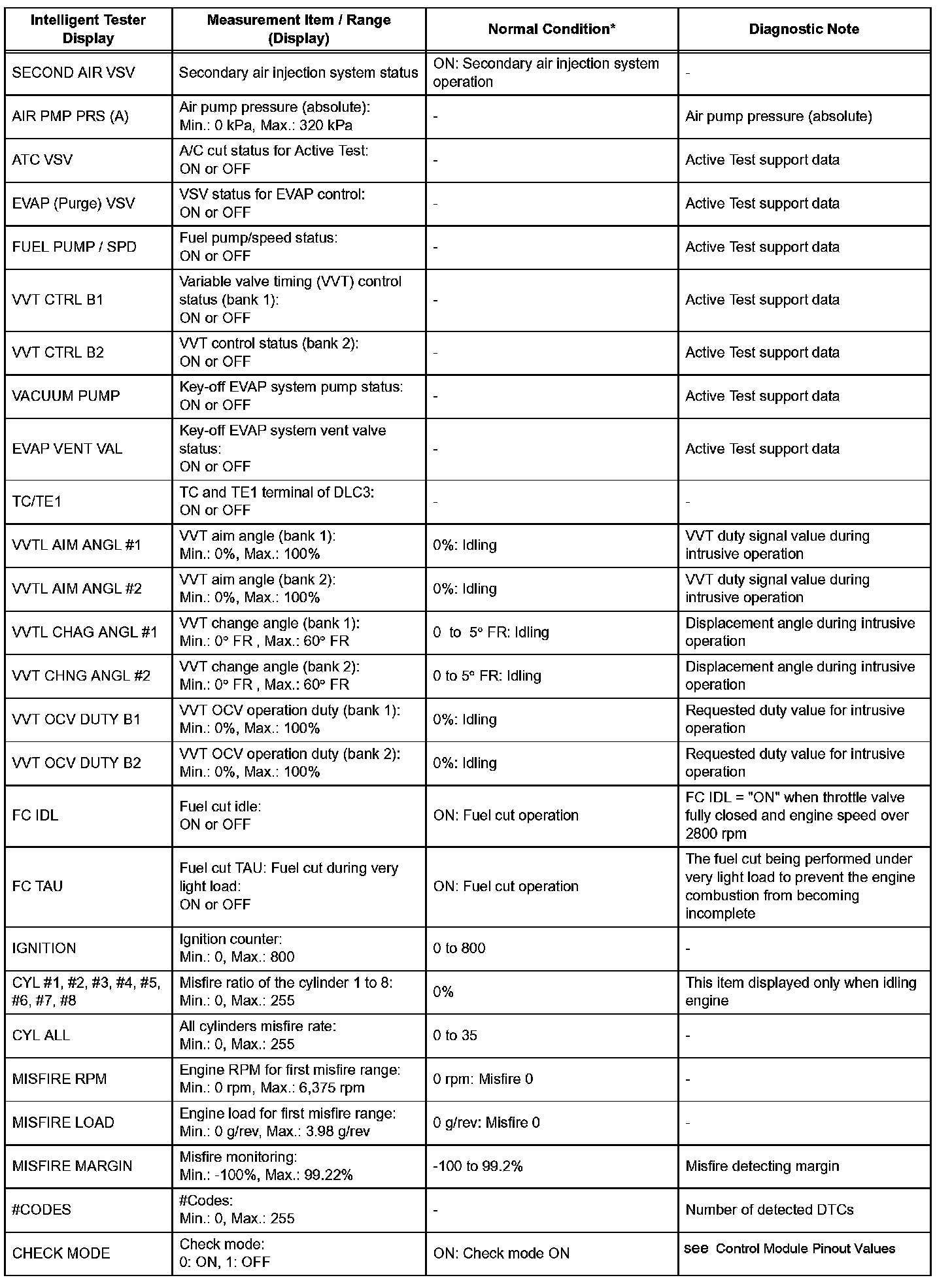 NOTE: In the table, the values listed under "Normal Condition" are reference values. Do not depend solely on these reference values when deciding whether a part is faulty or not.