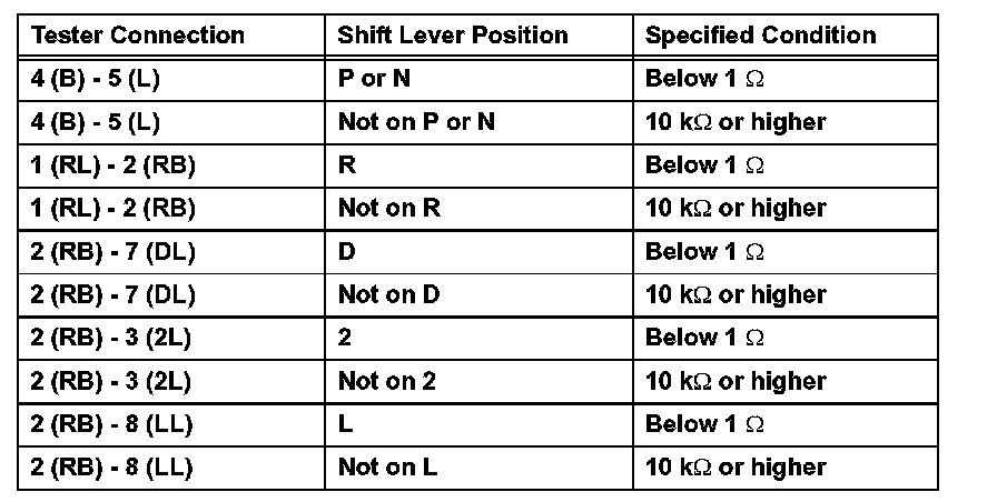 b) Measure the resistance of the PNP switch when the shift lever is moved to each position.