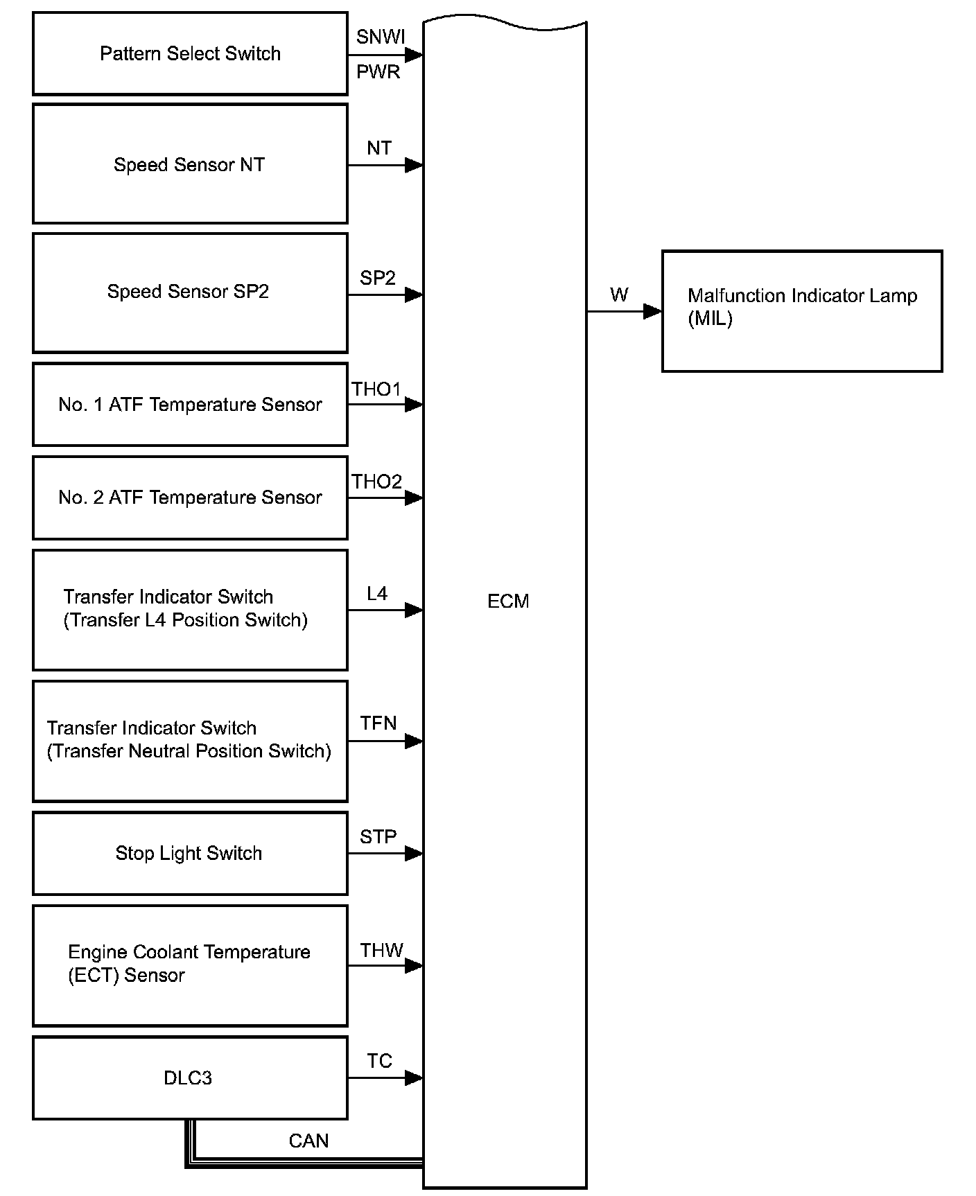 SYSTEM DIAGRAMThe configuration of the electronic control system in the A750F automatic transmission is as shown in the following chart.