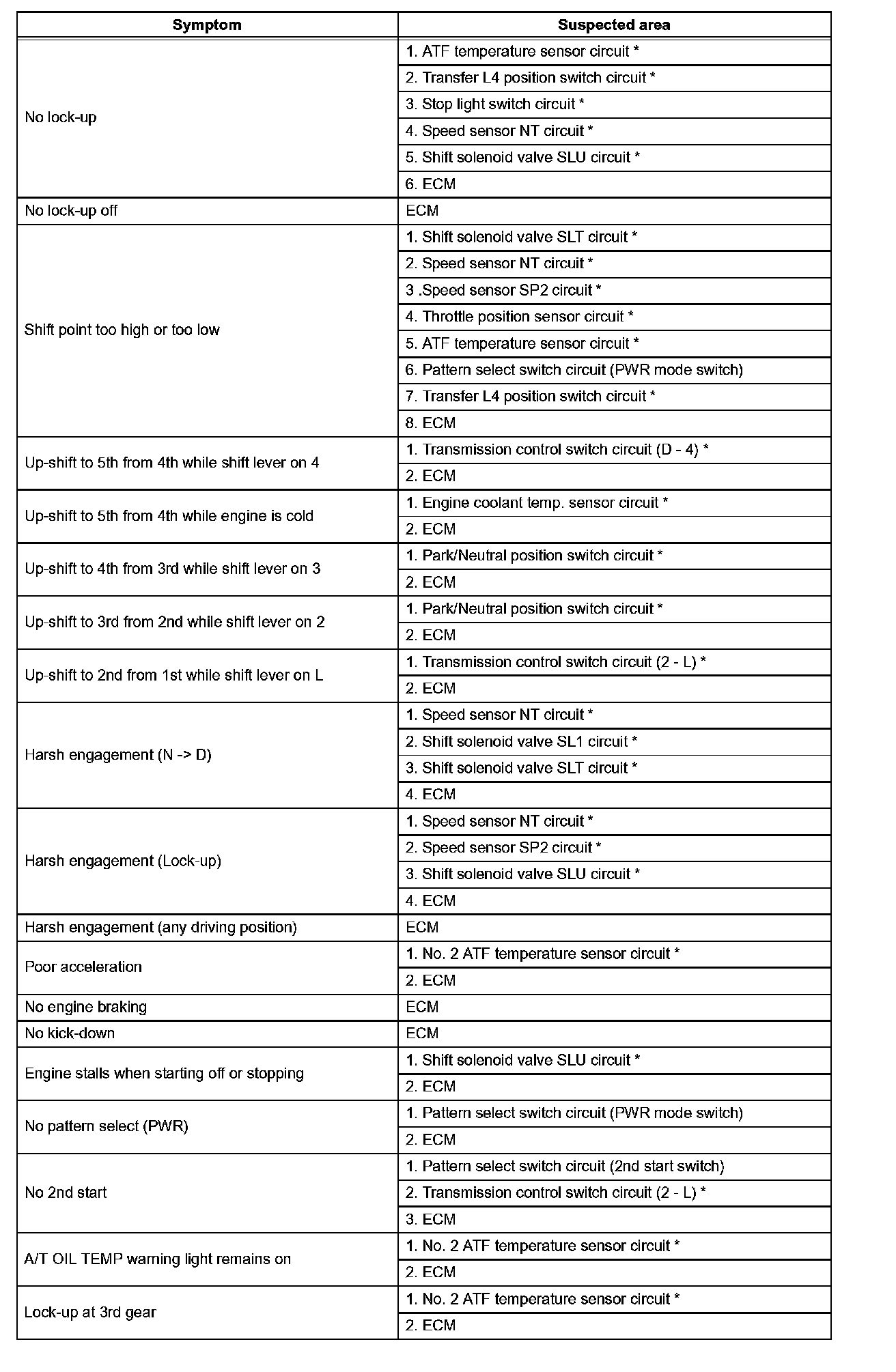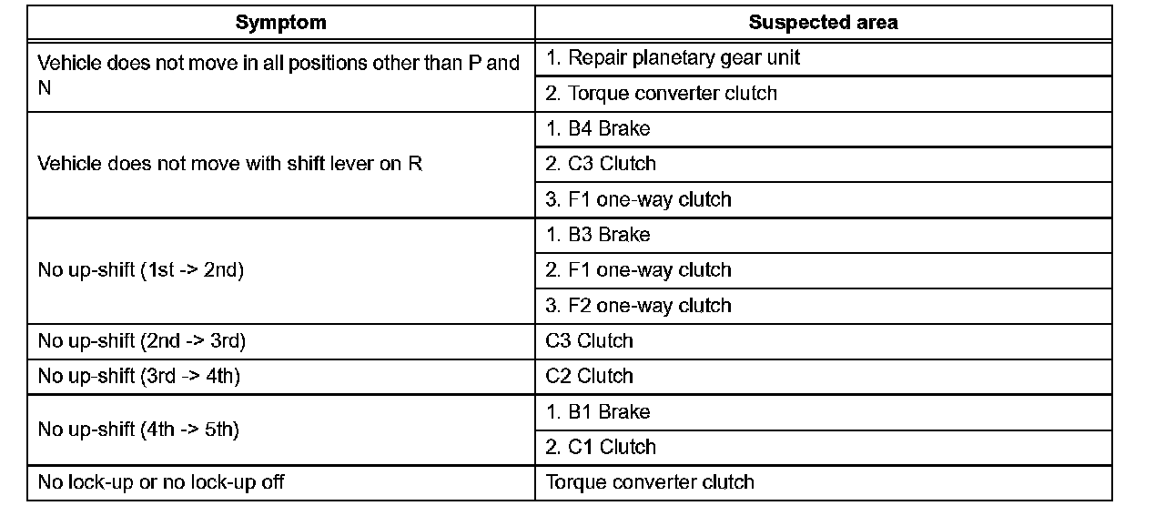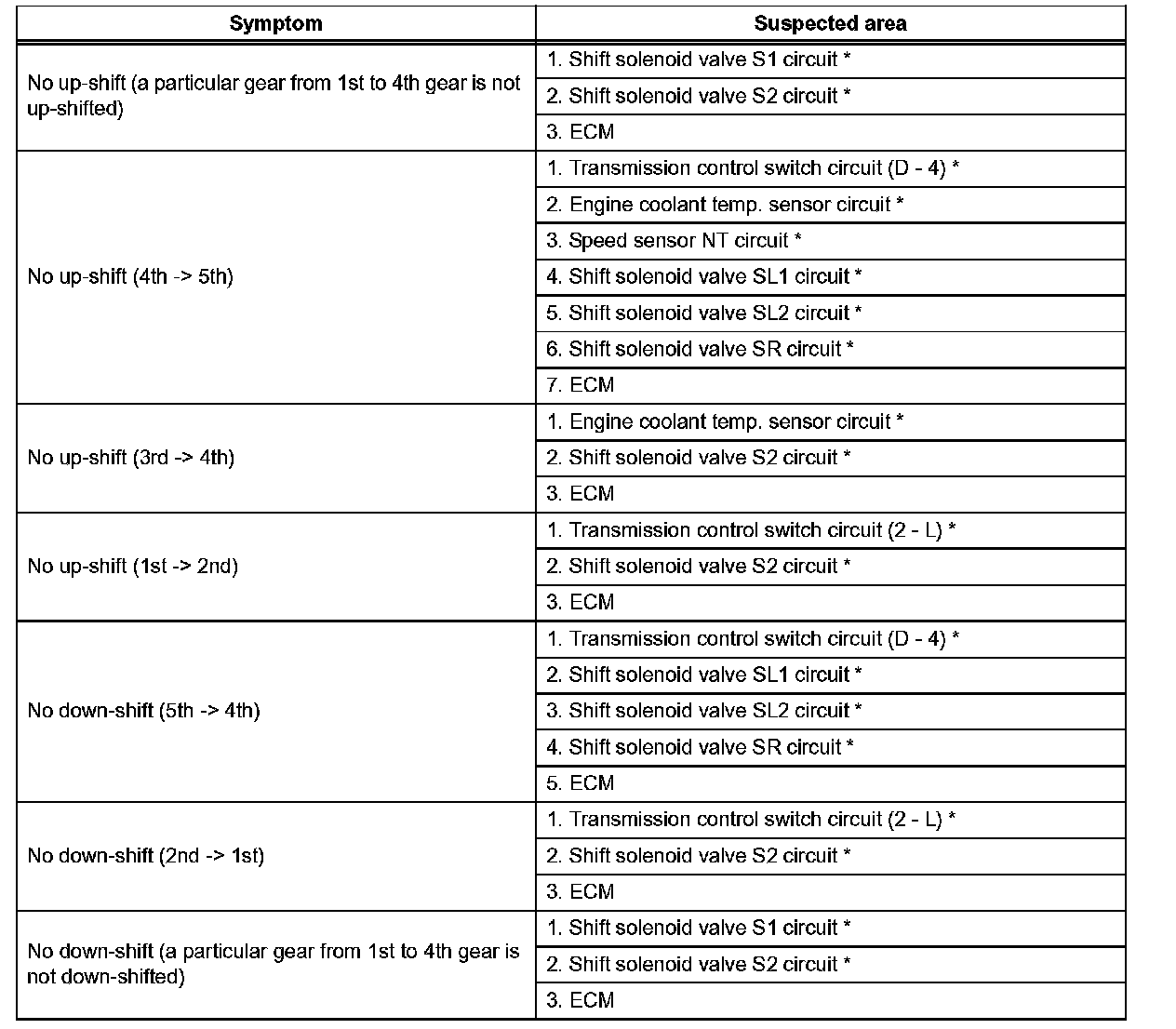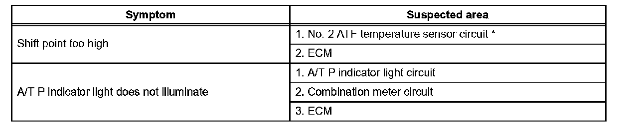 - If the instruction Proceed to next circuit inspection shown on problem symptoms table is given in the flowchart for each circuit, proceed to the next suspected area in the table.