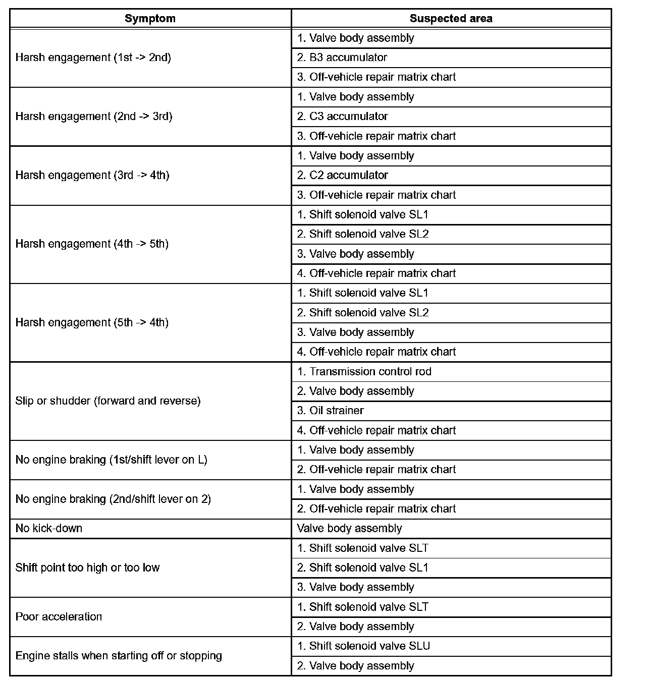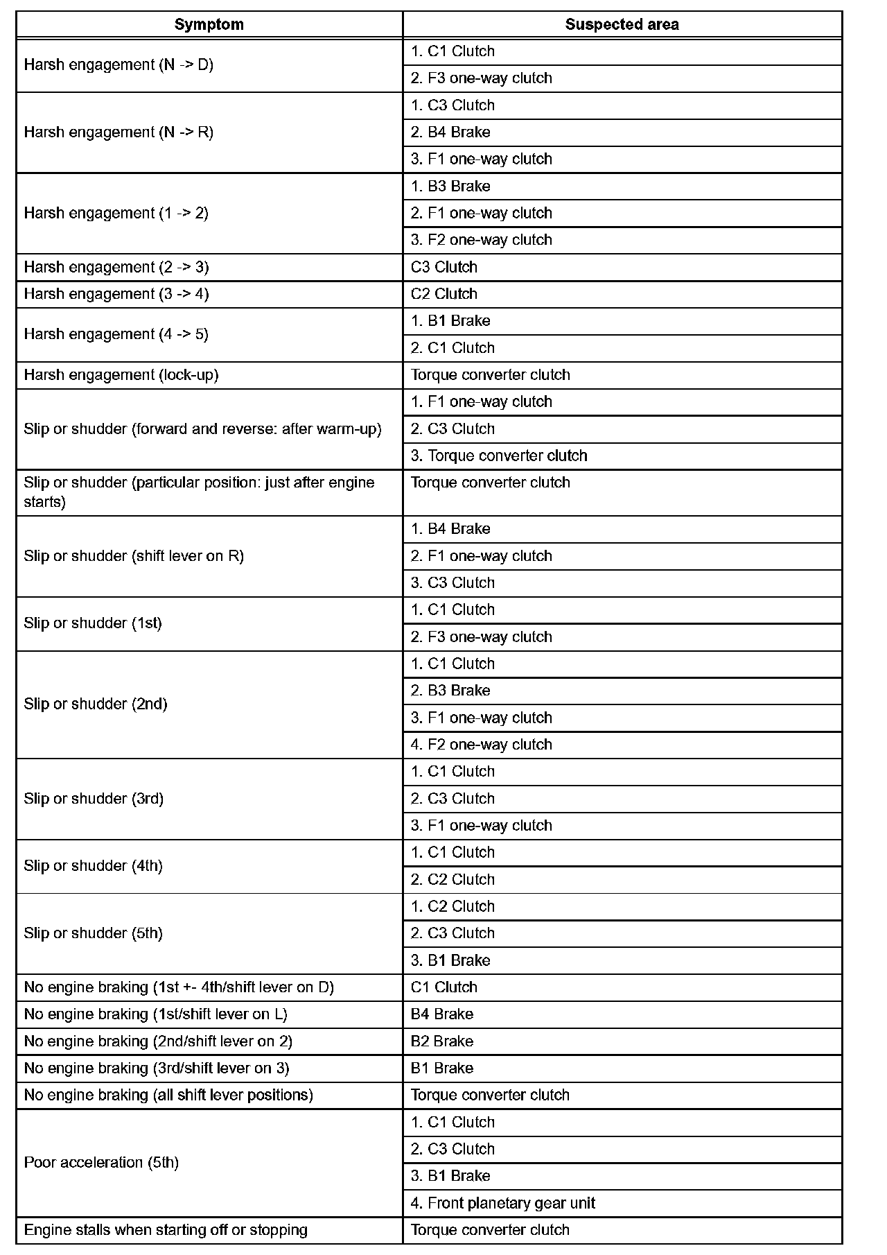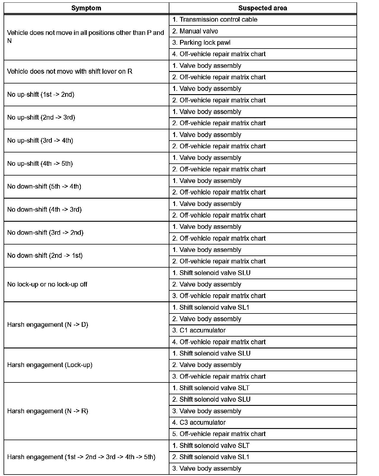 - Use the table to help determine the cause of the problem symptom. The potential causes of the symptoms are listed in order of probability in the Suspected area column of the table. Check each symptom by checking the suspected areas in the order they are listed. Replace parts as necessary.
