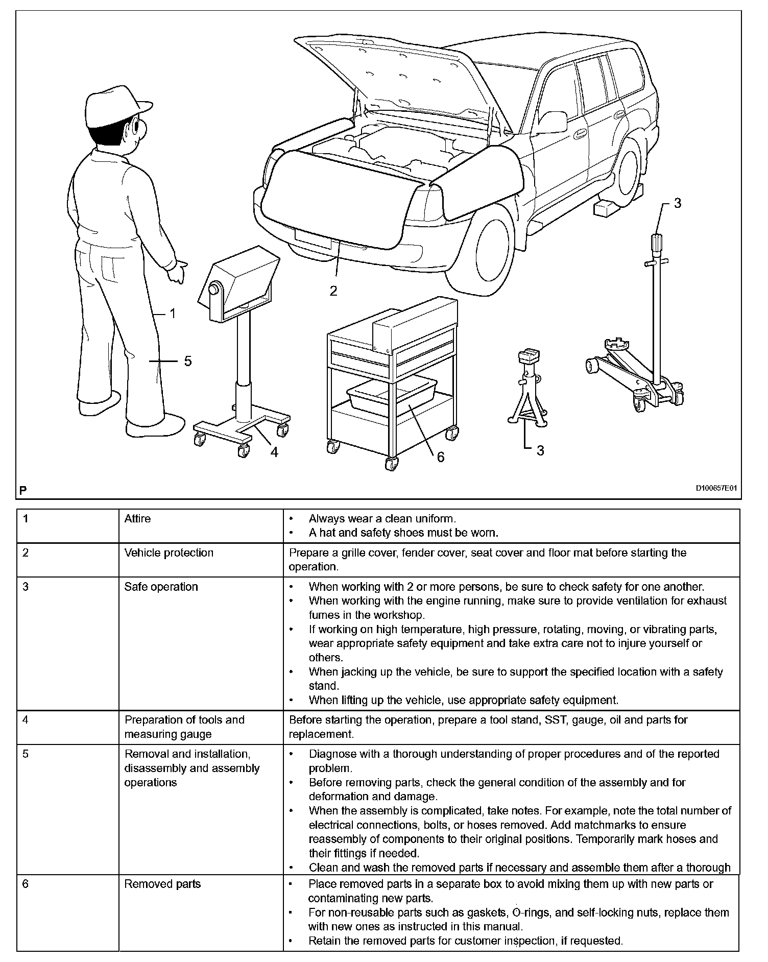 1. Care must be taken when jacking up and supporting the vehicle. Be sure to lift and support the vehicle at the proper locations.