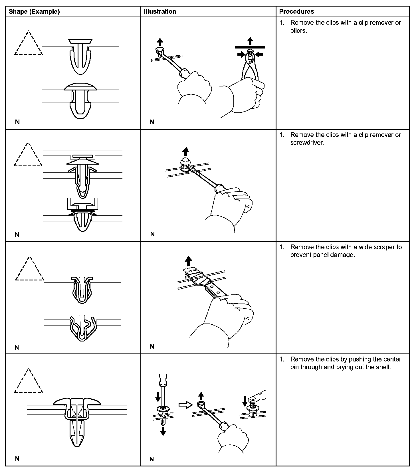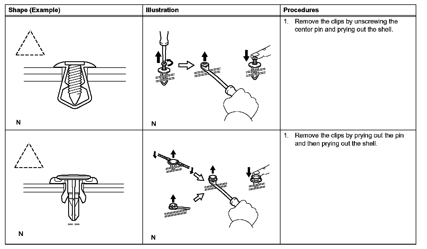 1. The removal and installation methods of typical clips used for vehicle body parts are shown in the table below.