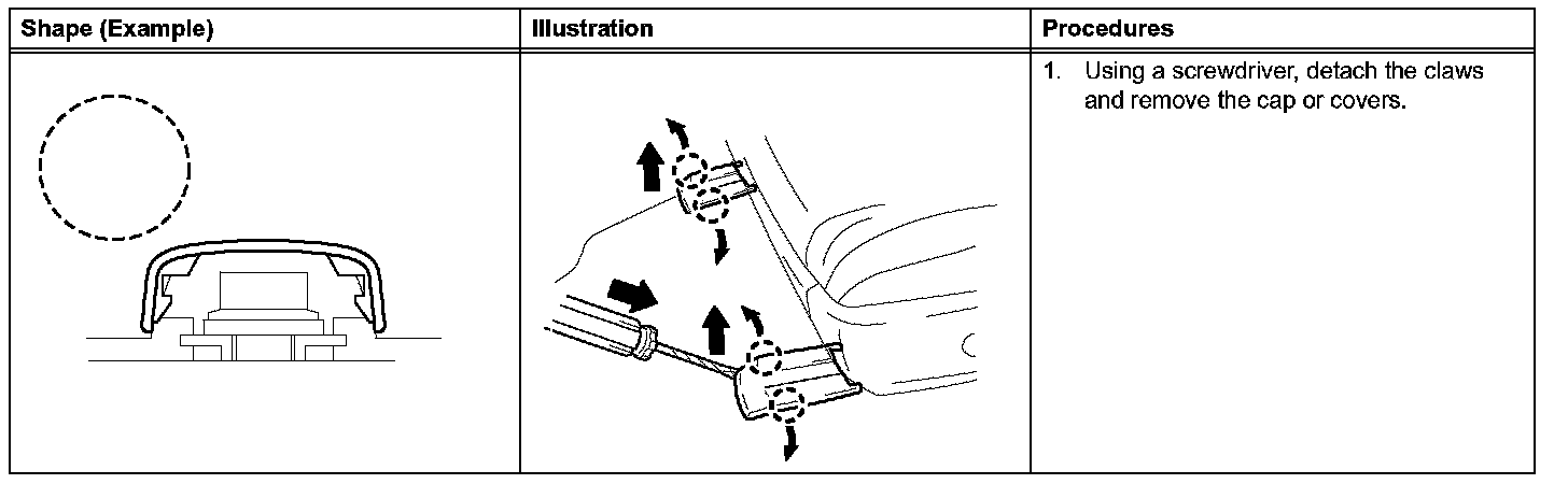 1. The removal and installation methods of typical claws used for vehicle body parts are shown in the table below.