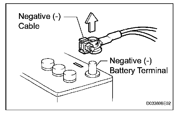 1. Before performing electronic work, disconnect the cable from the negative (-) battery terminal to prevent component and wire damage caused by accidental short circuits.