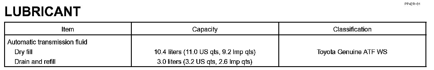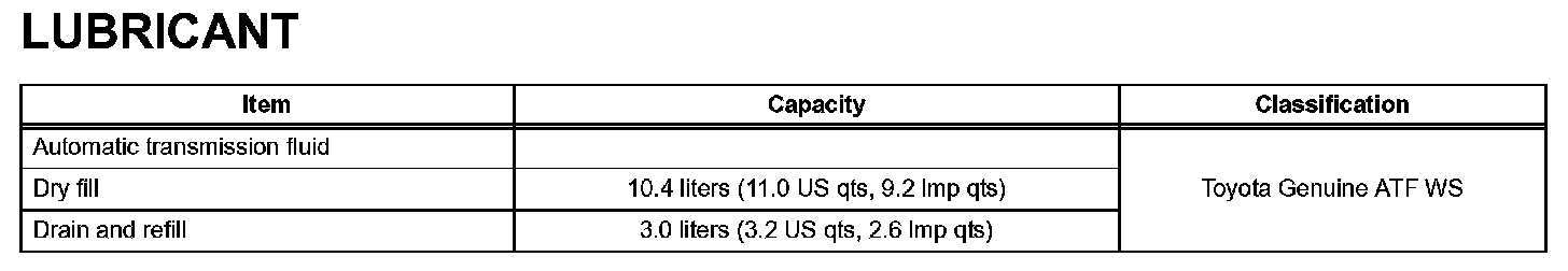 Notice: Using automatic transmission fluid other than "Toyota Genuine ATF Type WS" may cause deterioration in shift quality, locking up of your transmission accompanied by vibration, and ultimately damage the automatic transmission of your vehicle.
